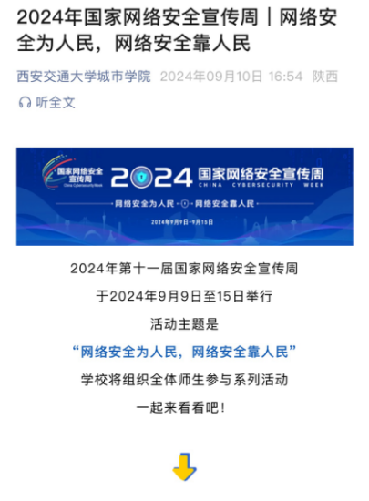 多渠道宣传网络安全知识,营造网络安全宣传氛围。9月9日至9月15日,通过线上线下相结合的方式以“网络安全为人民,网络安全靠人民”为主题,充分运用校内外各类宣传平台和新媒体等方式在校园广泛宣传,提升宣传效果,全面营造共筑网络安全防线的浓厚氛围。