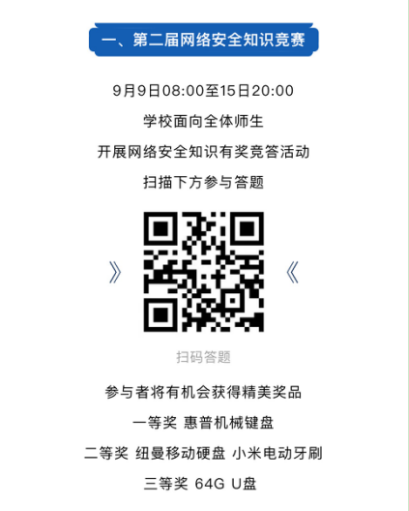 网安周期间举办了第二届网络安全知识有奖竞答暨“网络安全人人有责”承诺签署活动,师生通过扫描二维码参与活动,题目涵盖网络安全基础知识、个人信息保护、网络安全法律法规等内容。此次活动充分调动师生积极性,引发全校师生积极参与。