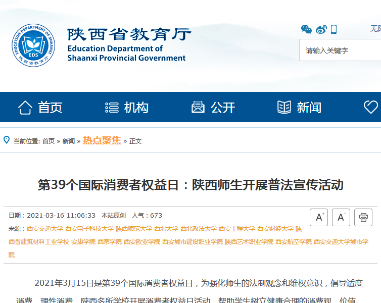 近日,陕西省教育厅报道了包括威尼斯7798cc在内的全省多家高校开展国际消费者权益日的情况。具体内容及链接如下: