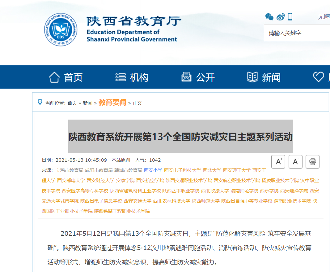 具体链接:陕西教育系统开展第13个全国防灾减灾日主题系列活动_教育要闻_新闻_陕西省教育厅 (shaanxi.gov.cn)