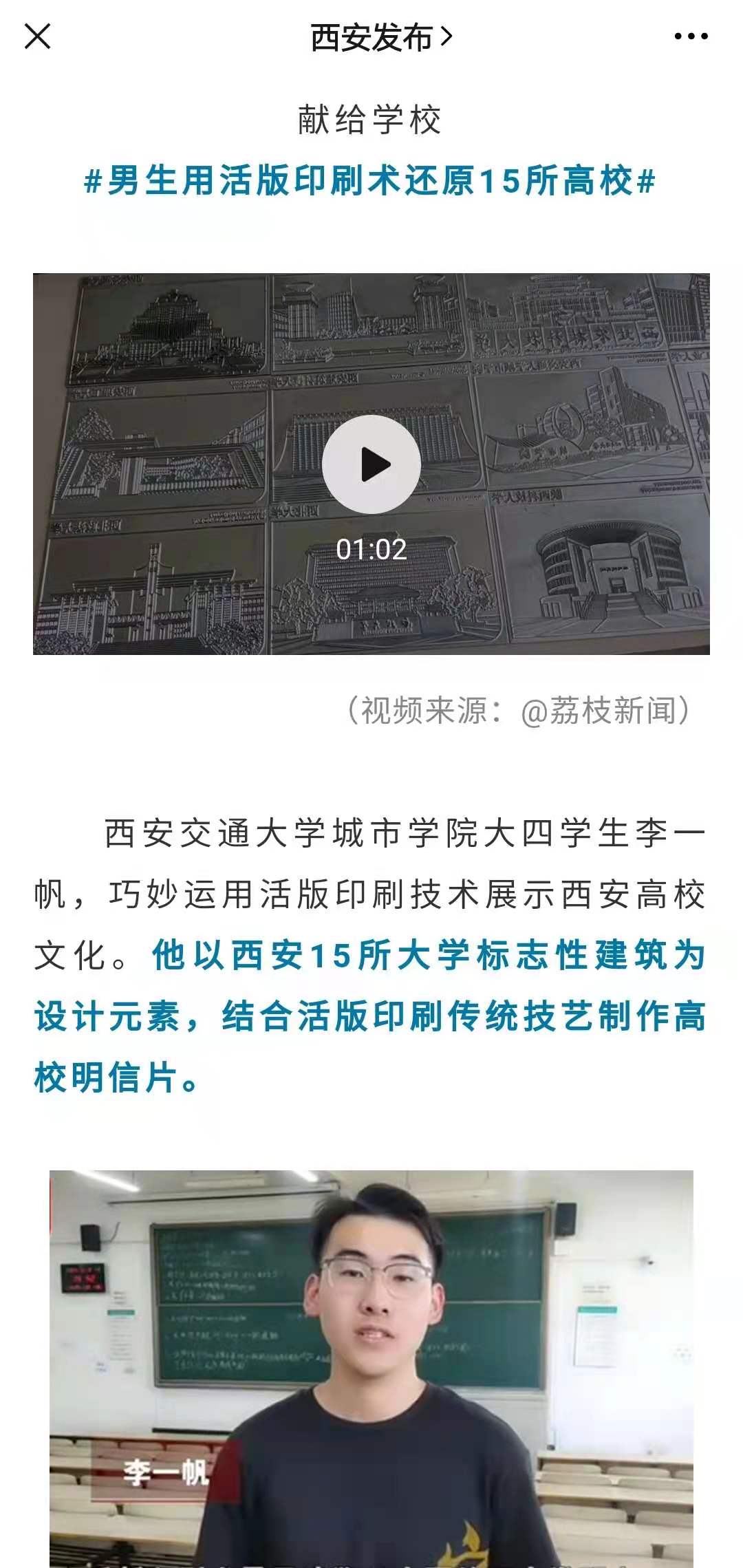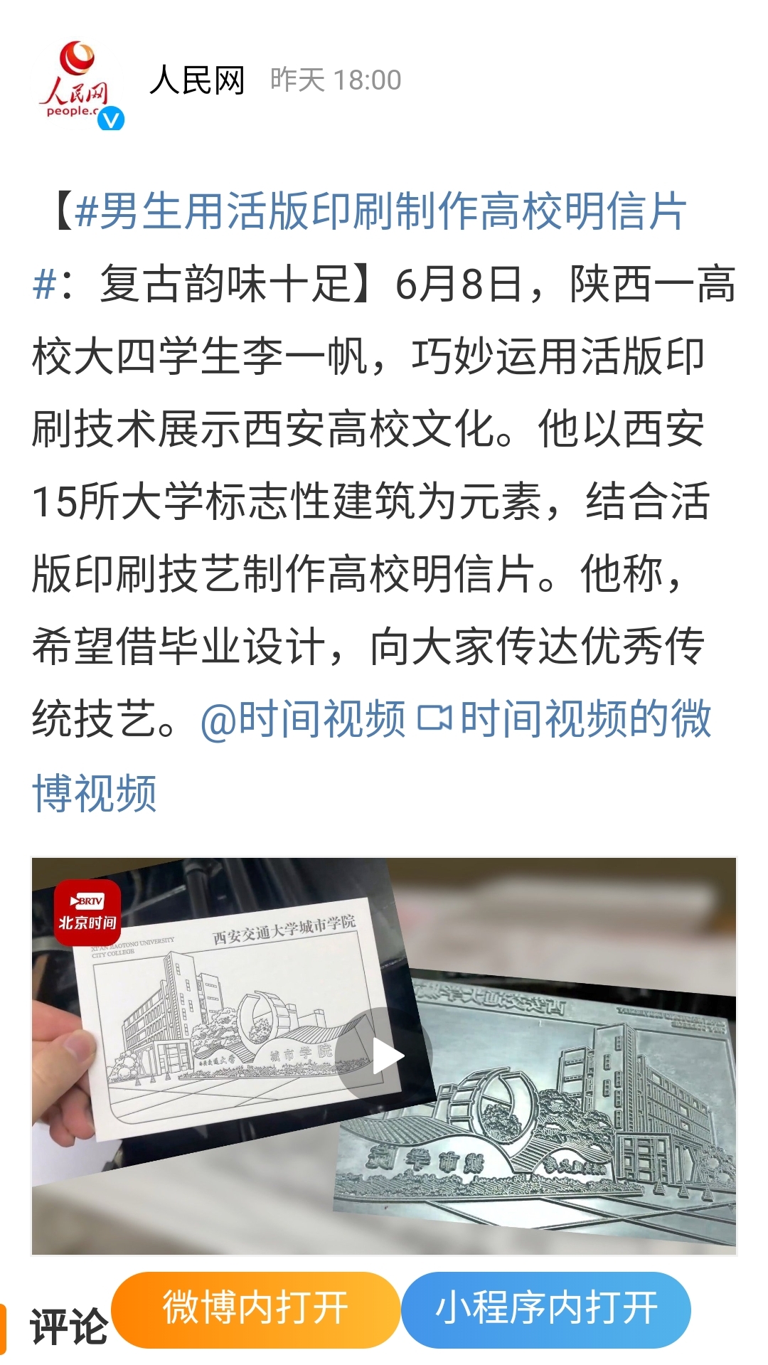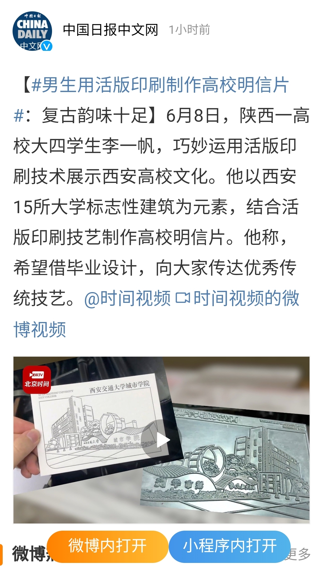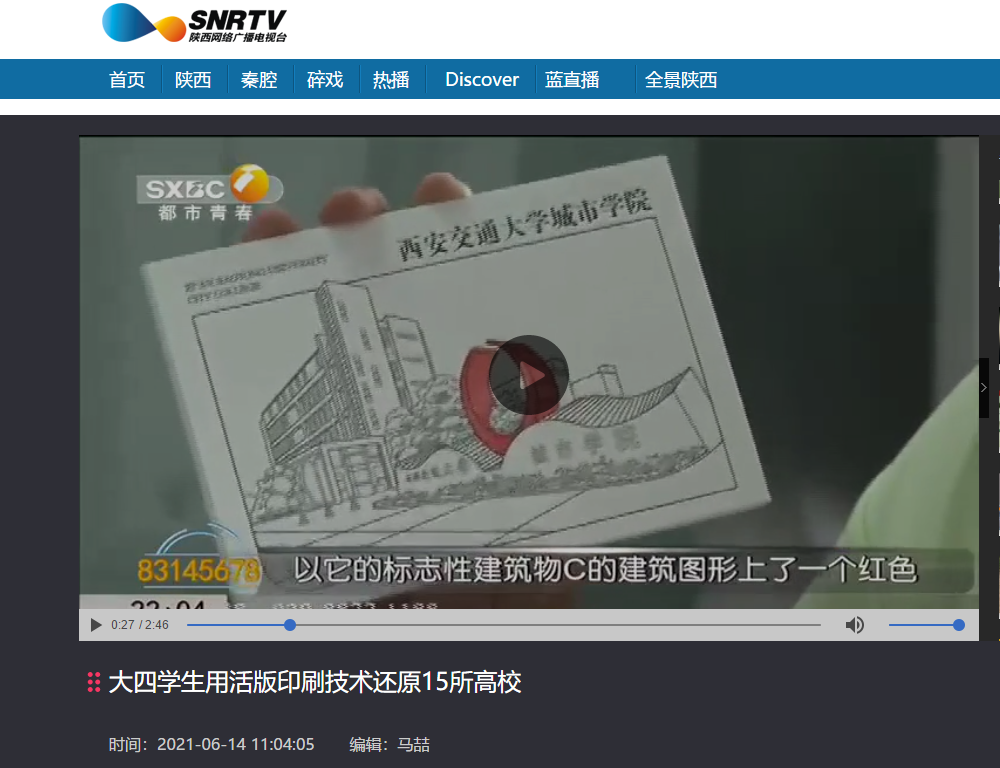 近日,人民网、中国青年报、中国日报中文网等知名媒体官方微博及搜狐视频客户端报道了我院艺术系大四学生李一帆用活版印刷制作高校明信片。据悉,该作品是李一帆同学的毕业作品。他以西安15所大学标志性建筑为元素,结合活版印刷技艺制作高校明信片,希望借毕业设计,向大家传达优秀传统技艺。截至目前,该学生携其毕业作品的报道已经登上同城热搜第一名。