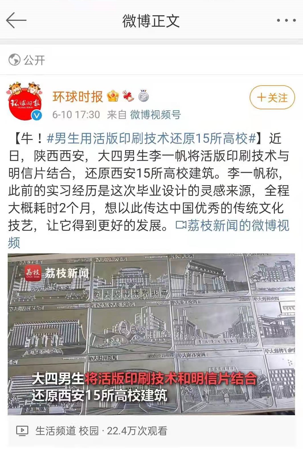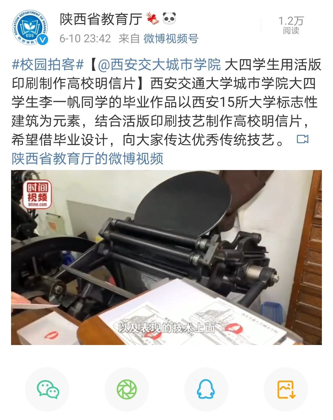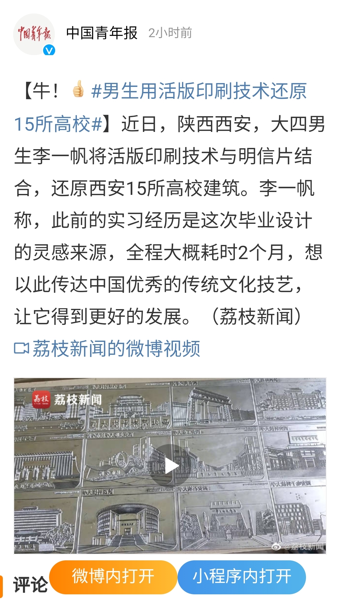 近日,人民网、中国青年报、中国日报中文网等知名媒体官方微博及搜狐视频客户端报道了我院艺术系大四学生李一帆用活版印刷制作高校明信片。据悉,该作品是李一帆同学的毕业作品。他以西安15所大学标志性建筑为元素,结合活版印刷技艺制作高校明信片,希望借毕业设计,向大家传达优秀传统技艺。截至目前,该学生携其毕业作品的报道已经登上同城热搜第一名。
