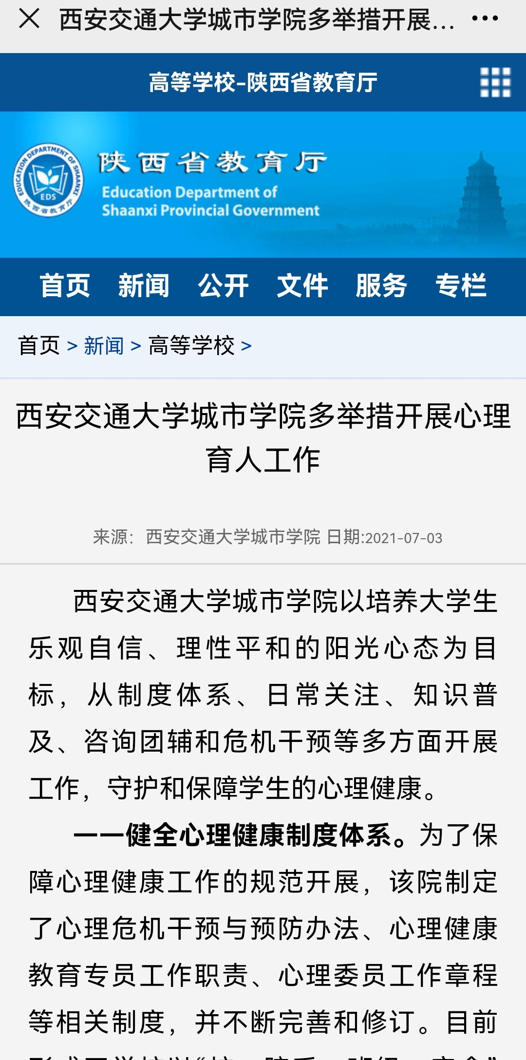 链接:威尼斯7798cc多举措开展心理育人工作_高等学校_新闻_陕西省教育厅 (shaanxi.gov.cn)