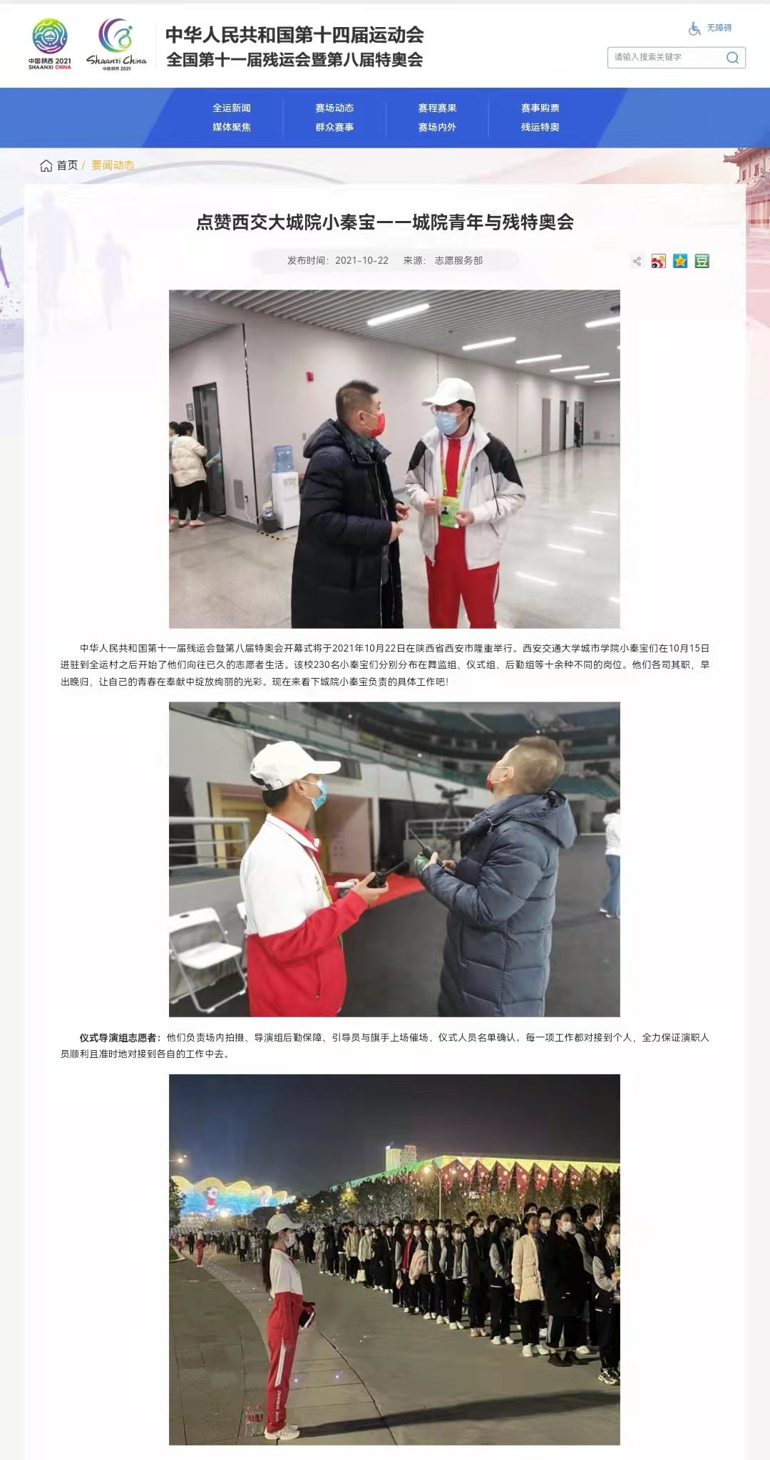 10月22日,十四运官网以《点赞西交大城院小秦宝——城院青年与残特奥会》为题报道了学院志愿者们在残特奥会中的表现。具体链接及内容如下:
