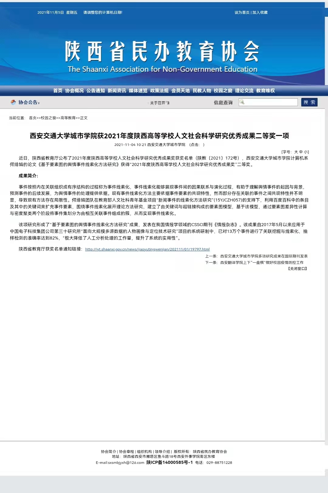 近日,陕西省民办教育协会报道了学院获2021年度陕西高等学校人文社会科学研究优秀成果奖情况。具体链接如下: