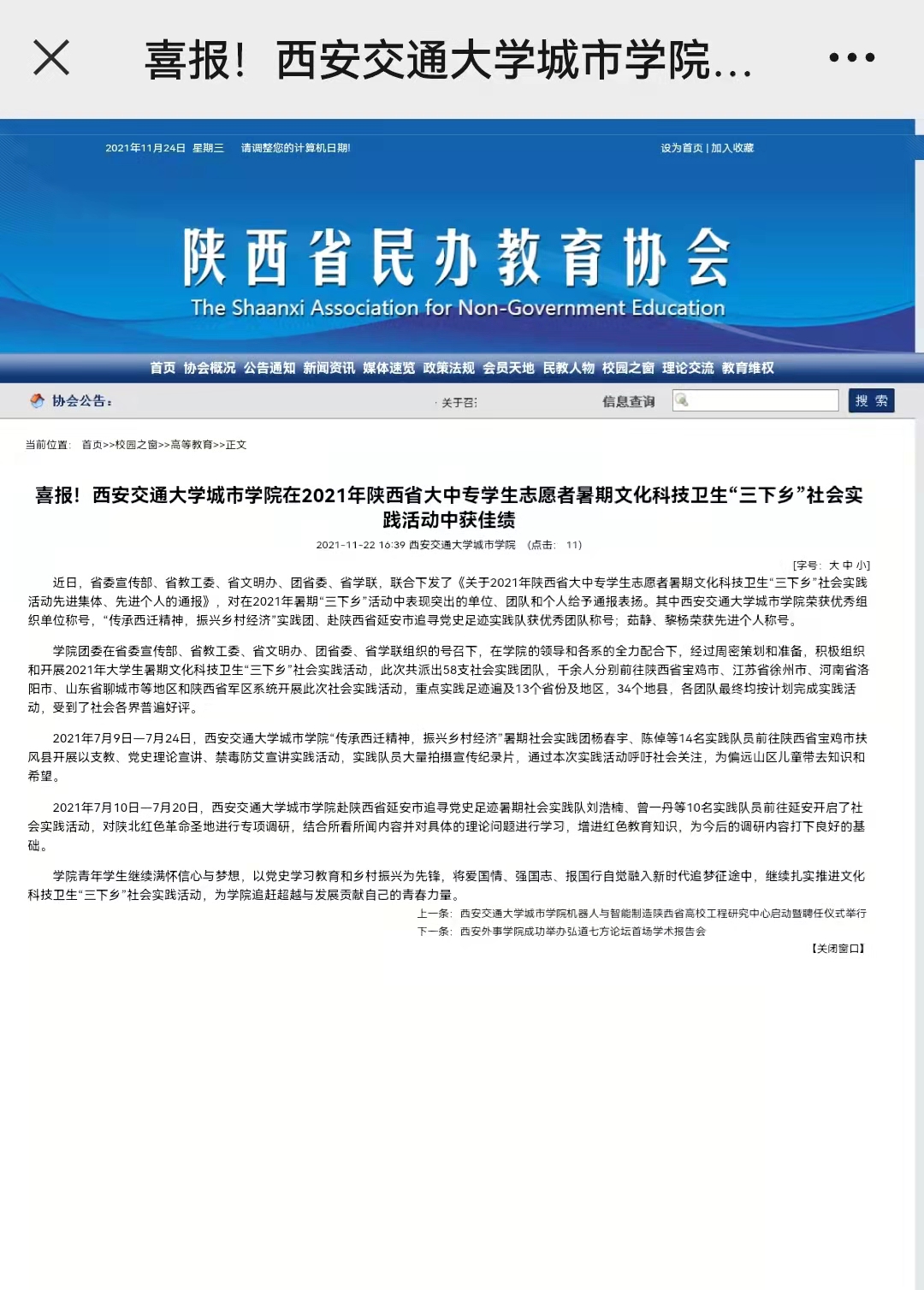 近日,陕西省民办教育协会报道了学院在2021年陕西省大中专学生志愿者暑期文化科技卫生“三下乡”社会实践活动中获奖情况。具体链接及内容如下:
