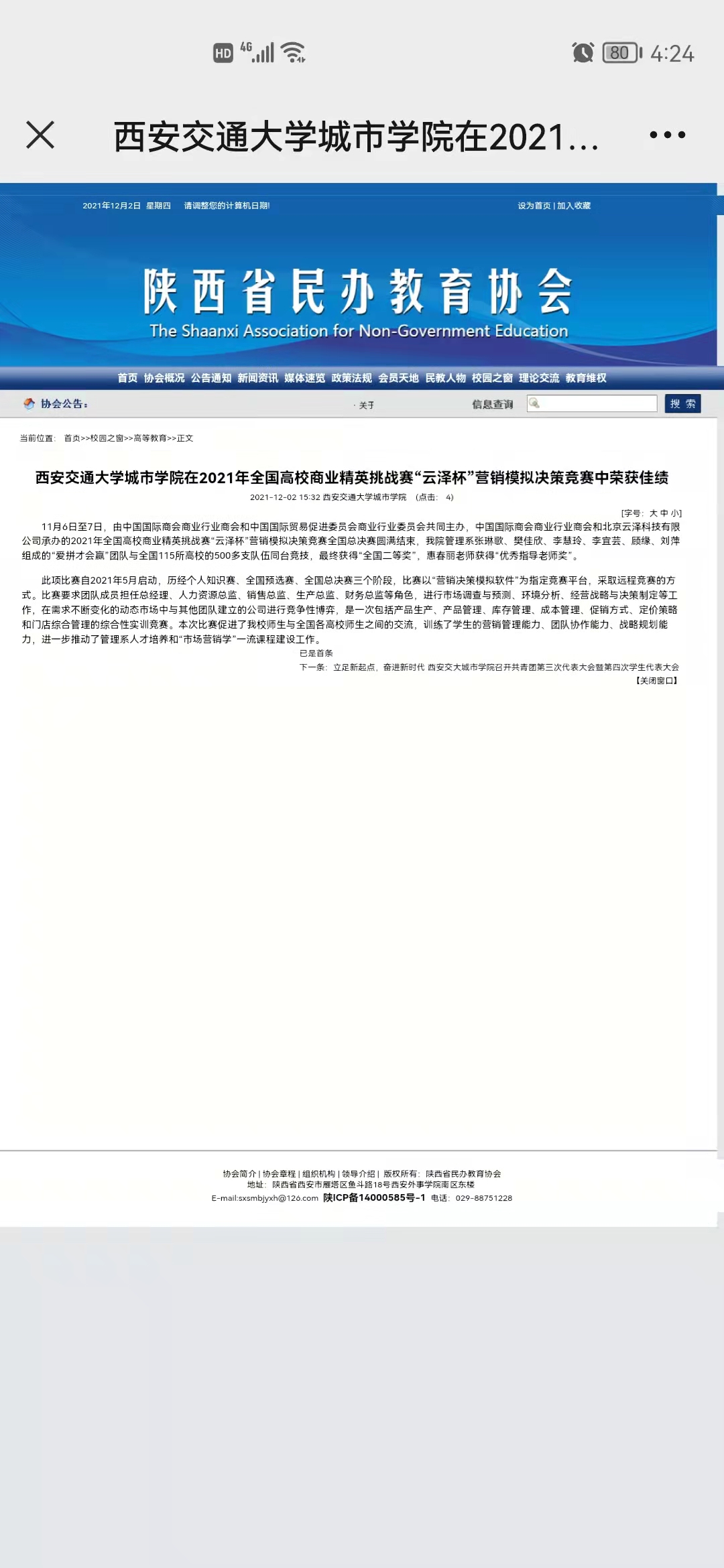 近日,陕西省民办教育协会报道了威尼斯7798cc在2021年全国高校商业精英挑战赛“云泽杯”营销模拟决策竞赛中荣获佳绩情况,具体链接及内容如下: