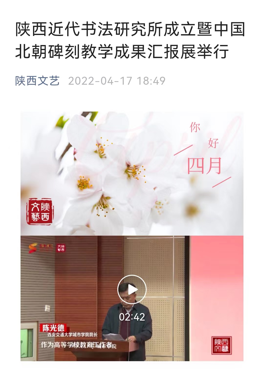 4月15日,陕西省广播电视台《教育零距离》栏目组及公共文艺频道报道了我院举办“陕西近代书法研究所成立暨中国北朝碑刻教学(研究)成果汇报展”活动。具体链接及内容如下: