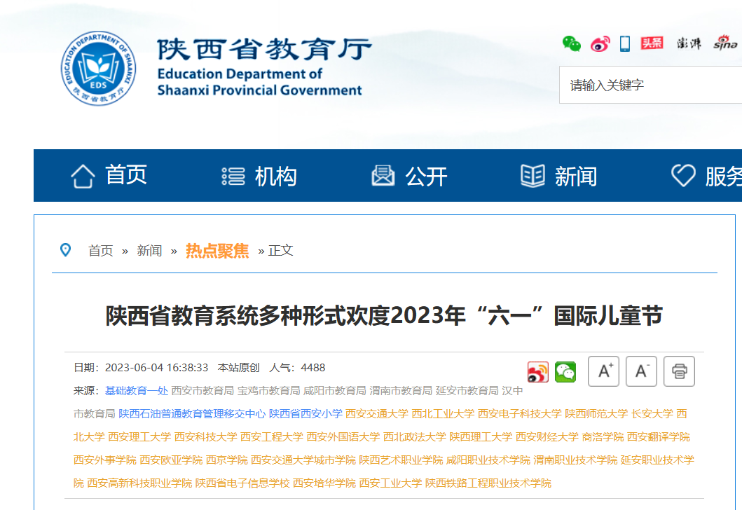 近日,陕西省教育厅报道了学院庆祝2023年“六一”国际儿童节的内容。具体如下: