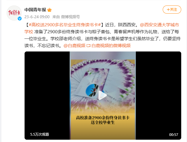 近日,中国青年报、中国大学生在线、中华全国学联、长春晚报、白鹿视频等微博对“学院送2900名毕业生终身读书卡”事件进行了报道。同时该话题登上了6月24日微博同城热搜第七名。