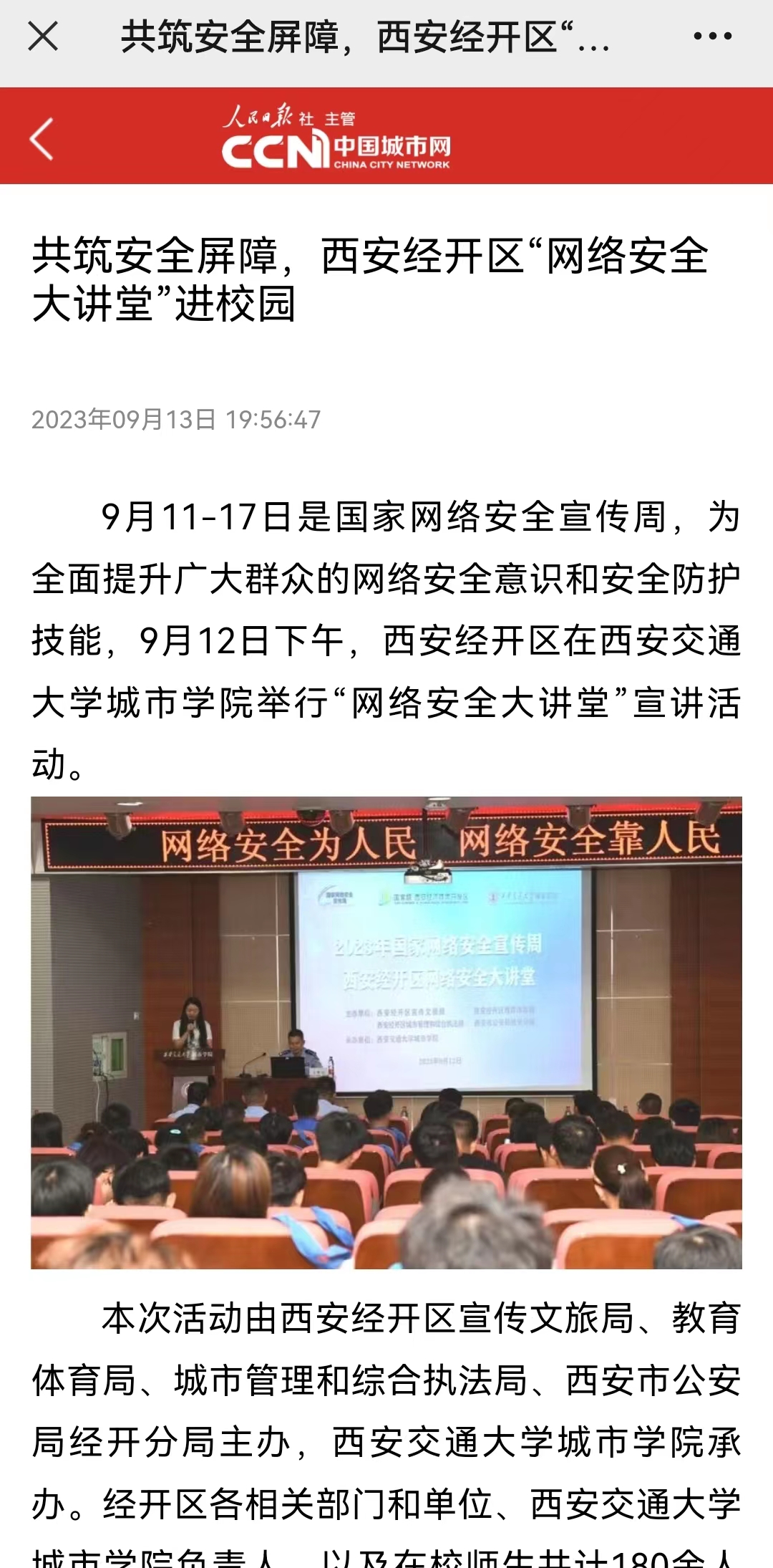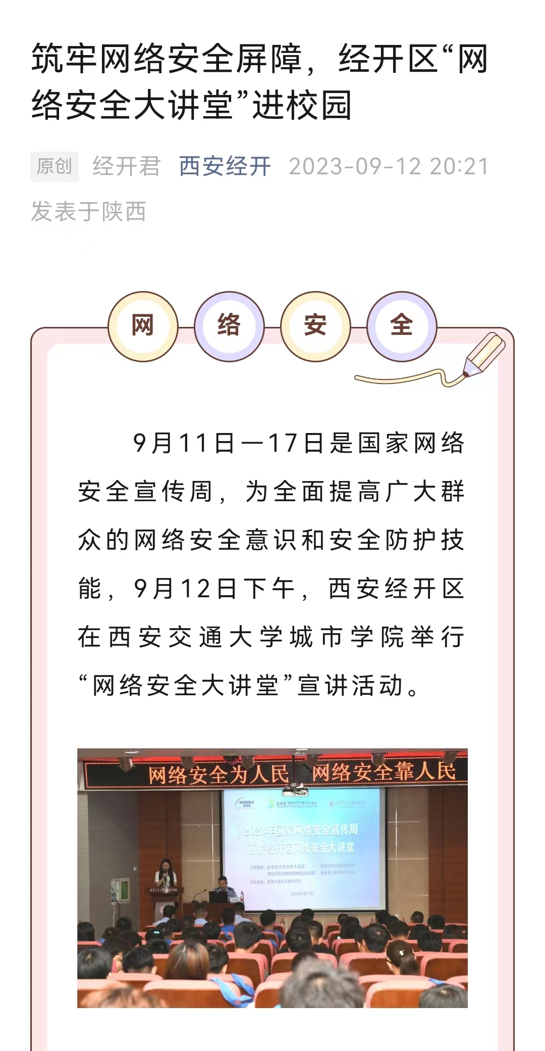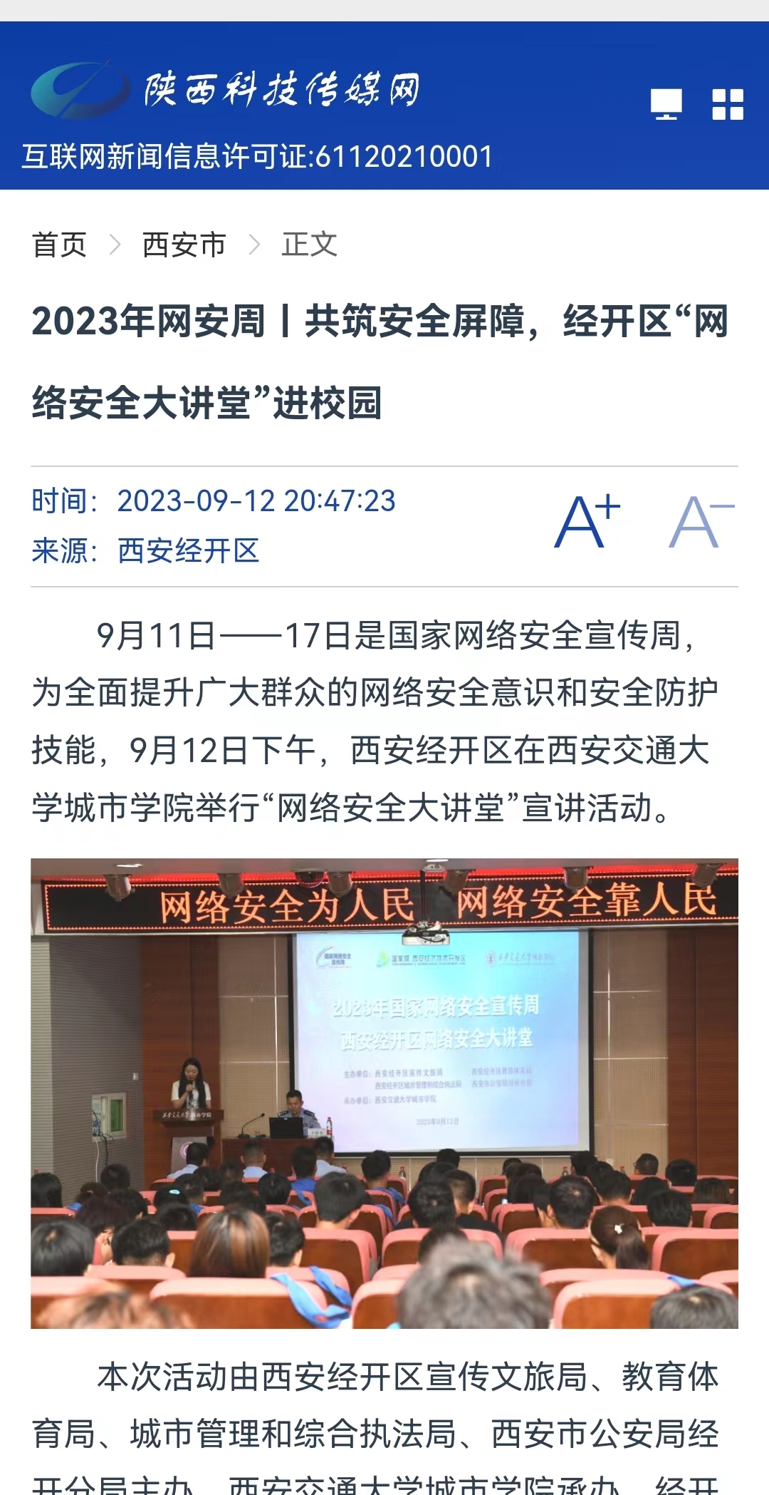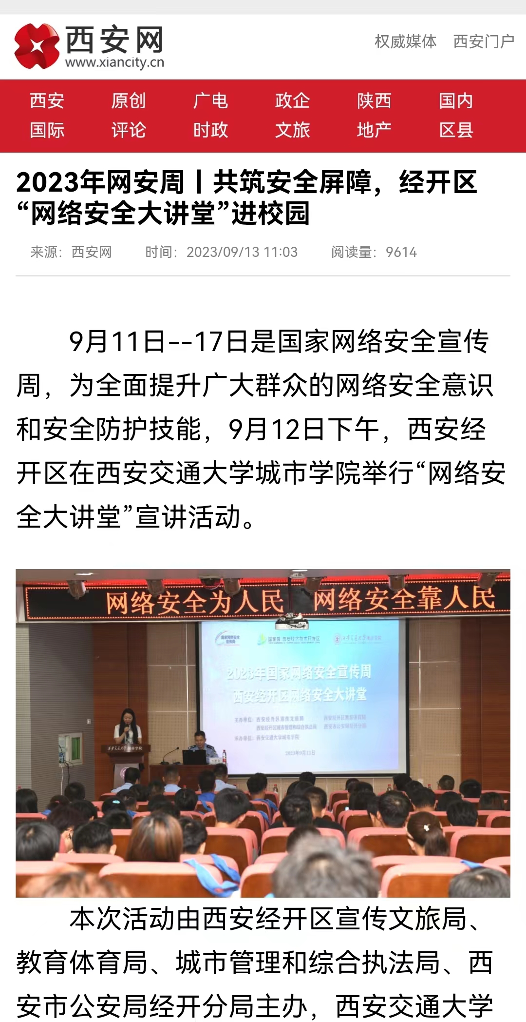 近日,中央广电总台国际在线、中国城市网、中国青年网、中国周刊网、陕西科技传媒网、阳光网、西安网、凤凰新闻、搜狐新闻、网易新闻、原点新闻、西安经开对西安经开区“网络安全大讲堂”走进威尼斯7798cc进行了报道。