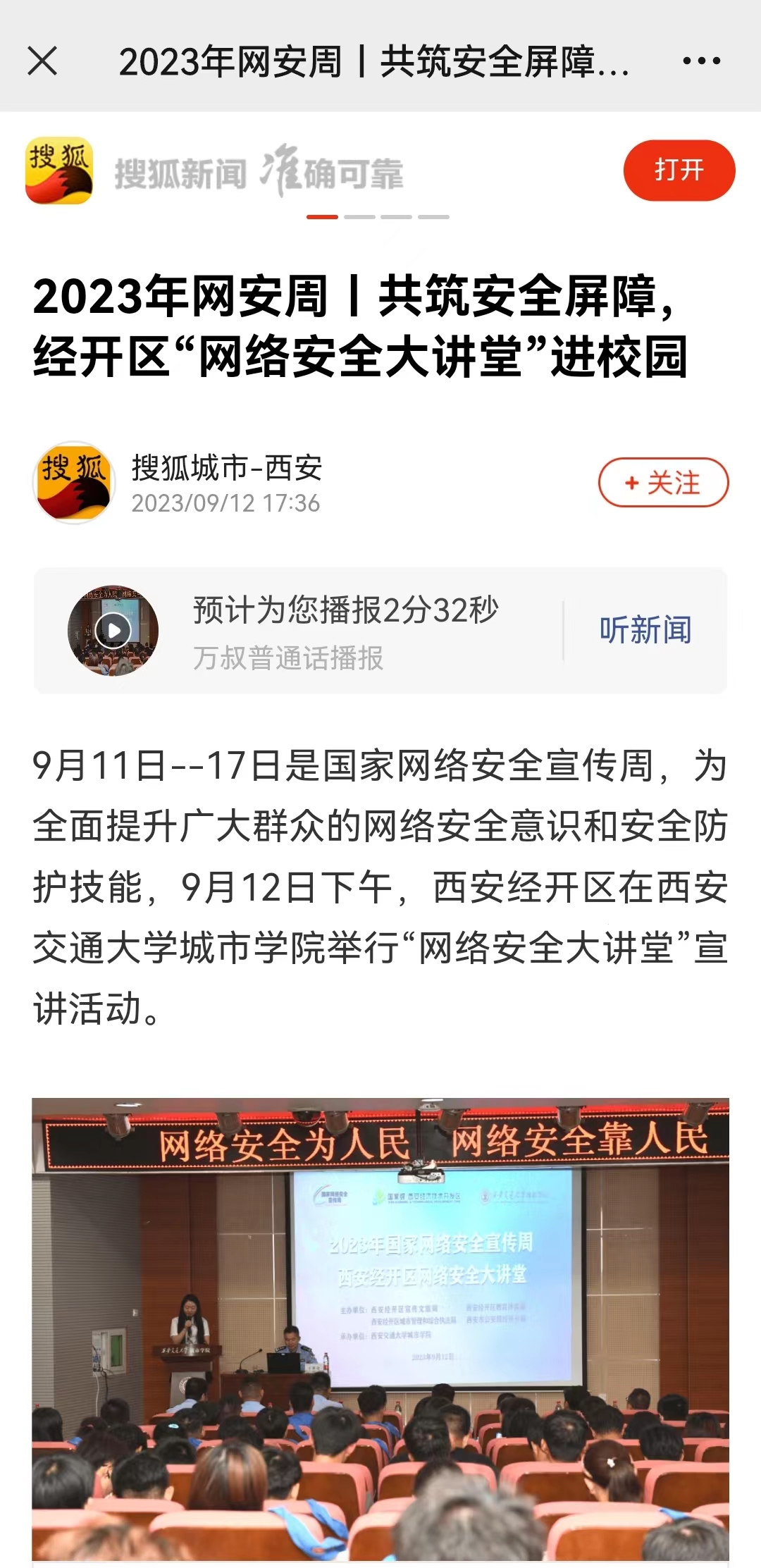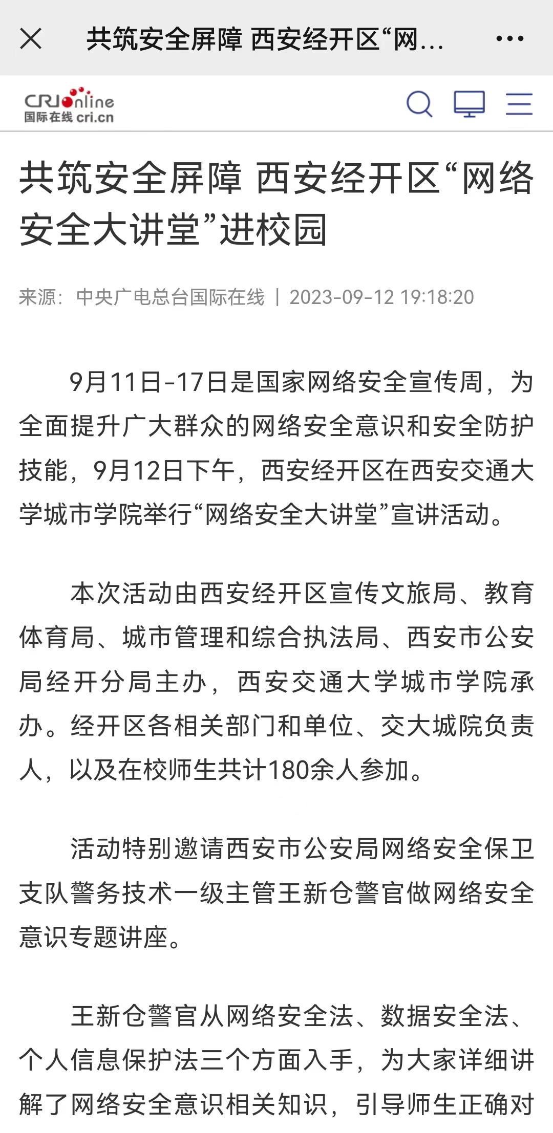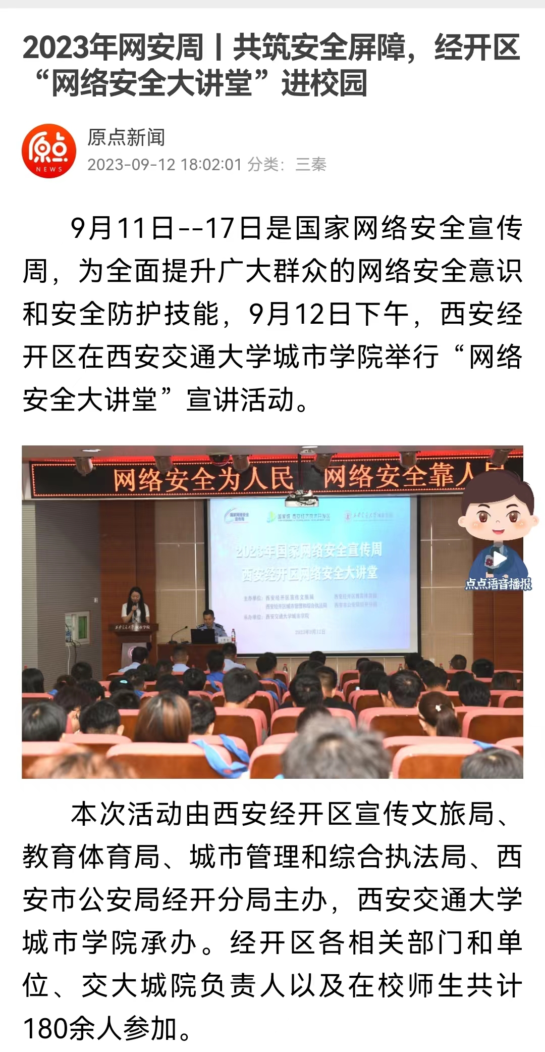 近日,中央广电总台国际在线、中国城市网、中国青年网、中国周刊网、陕西科技传媒网、阳光网、西安网、凤凰新闻、搜狐新闻、网易新闻、原点新闻、西安经开对西安经开区“网络安全大讲堂”走进威尼斯7798cc进行了报道。