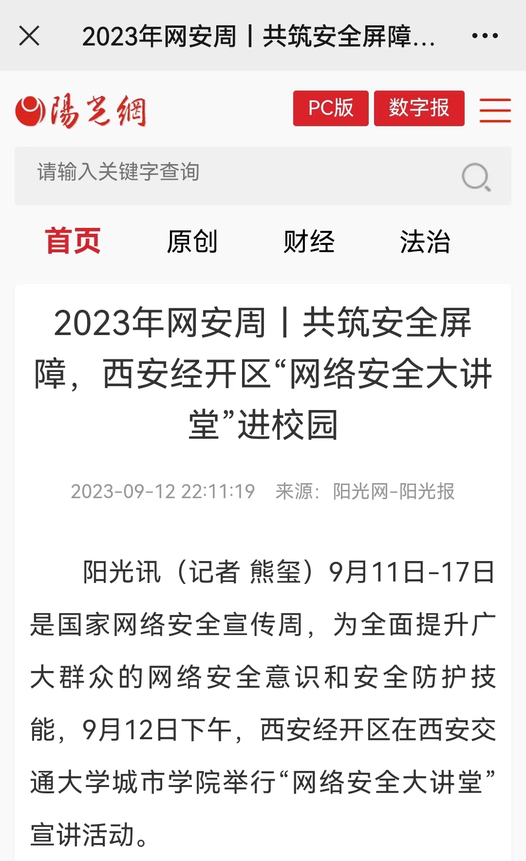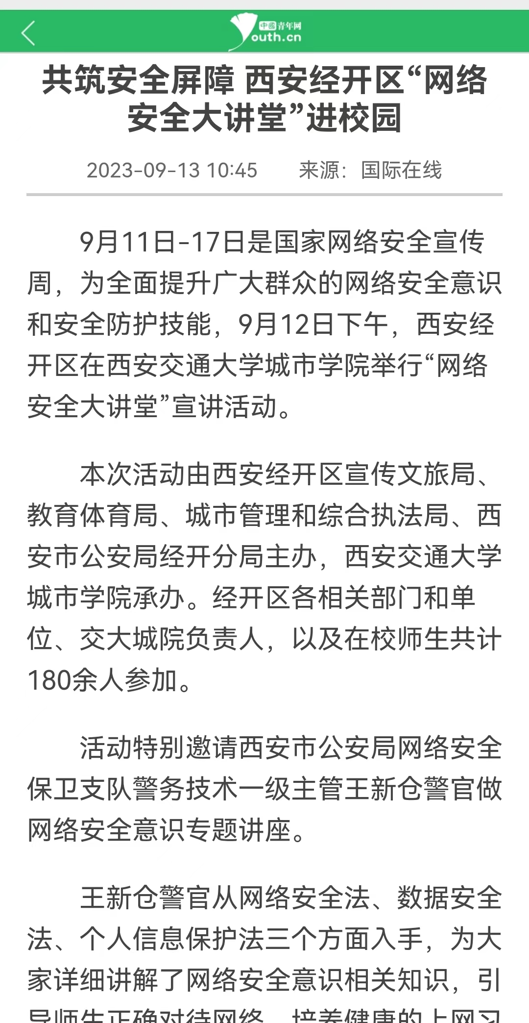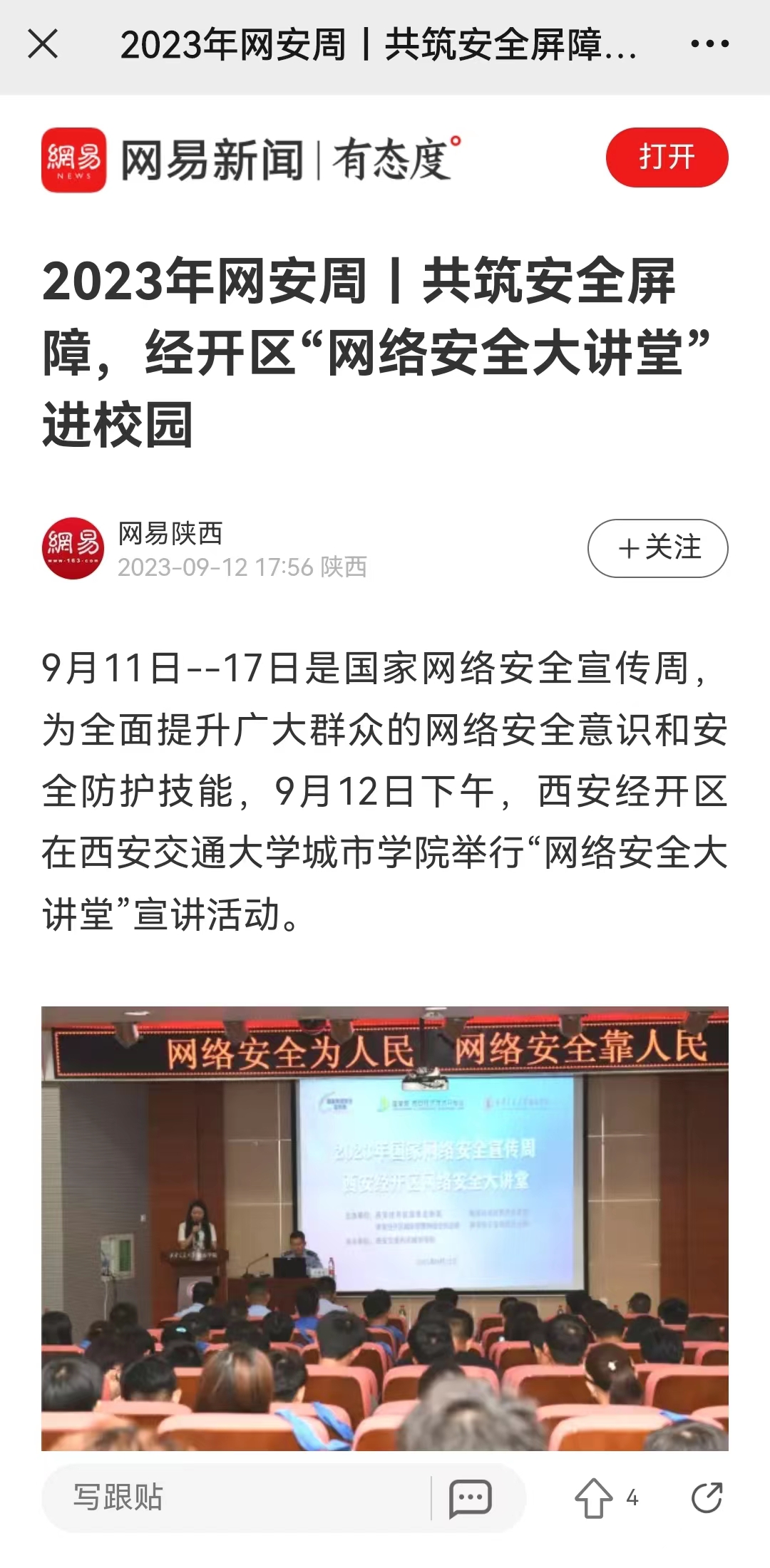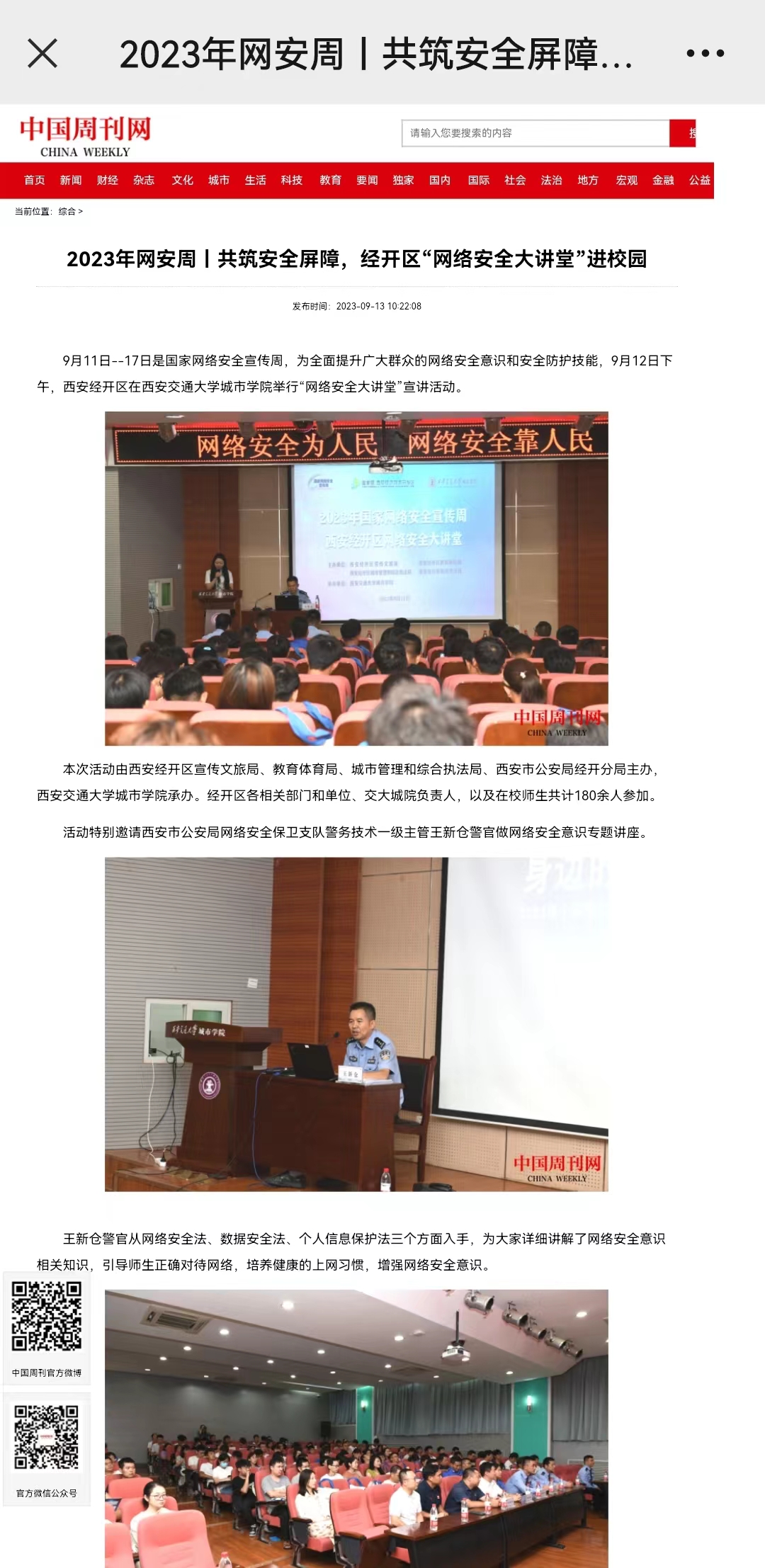 近日,中央广电总台国际在线、中国城市网、中国青年网、中国周刊网、陕西科技传媒网、阳光网、西安网、凤凰新闻、搜狐新闻、网易新闻、原点新闻、西安经开对西安经开区“网络安全大讲堂”走进威尼斯7798cc进行了报道。