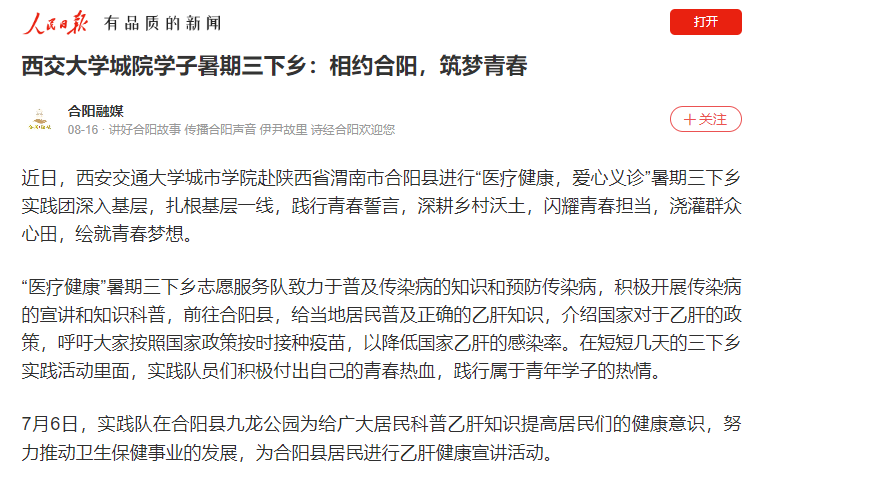 近日,合阳融媒对学院学子暑期三下乡进行了报道,具体链接及内容如下:
