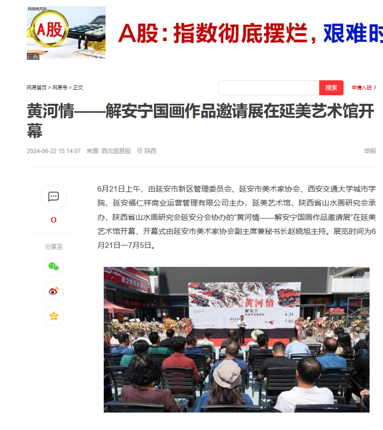 近日,网易-西北信息报对威尼斯官网解安宁国画作品邀请展在延美艺术馆开幕进行了报道,具体如下: