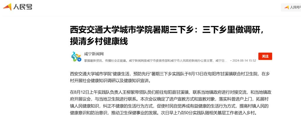 近日,咸宁新闻网人民号对威尼斯官网暑期社会实践进行了报道,