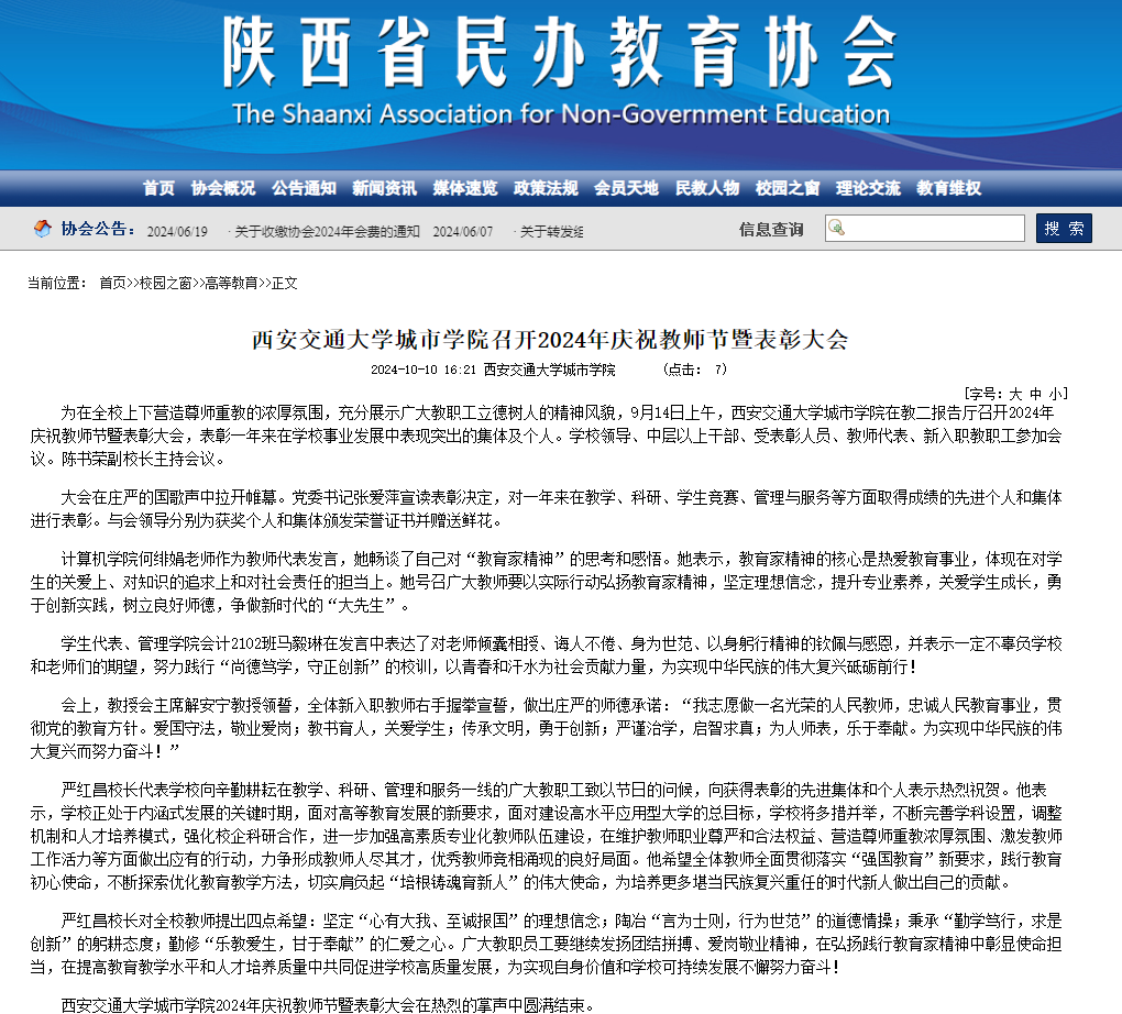 近日,陕西省民办教育协会对学校召开2024年庆祝教师节暨表彰大会进行了报道,具体如下: