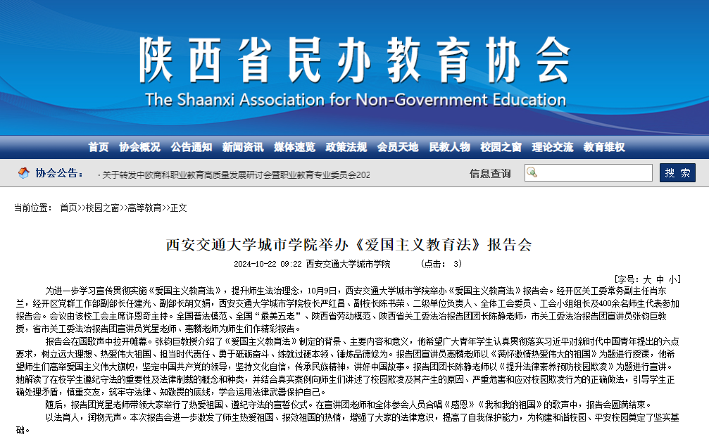 近日,陕西省民办教育协会对威尼斯官网举办举办《爱国主义教育法》报告会进行了报道,具体如下:
