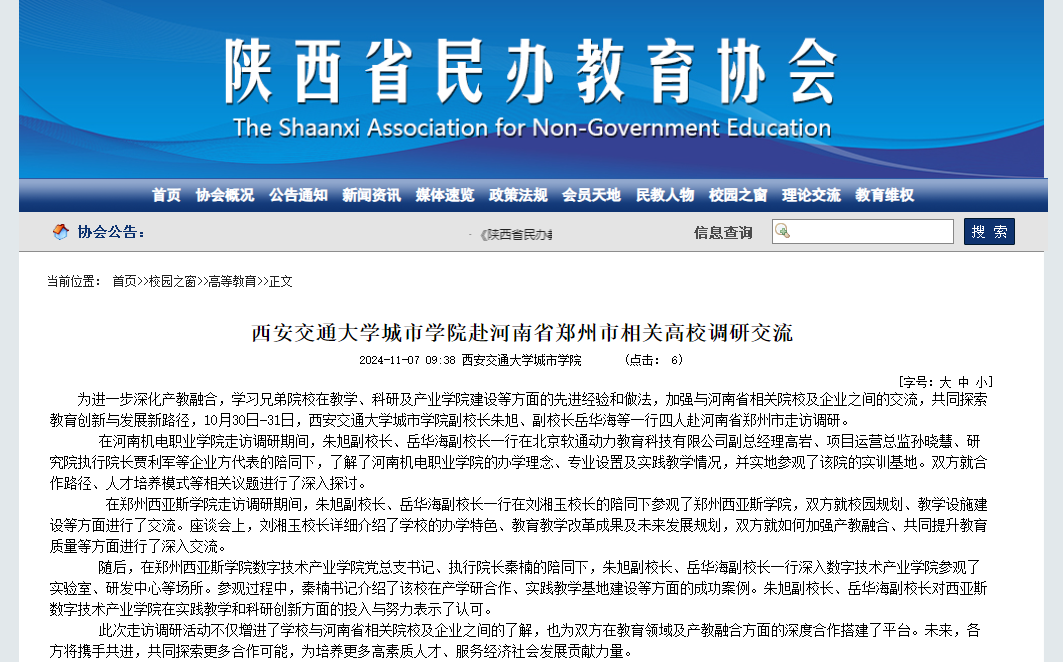 近日,陕西省民办教育协会对威尼斯官网赴河南省郑州市相关高校调研交流进行了报道,具体如下: