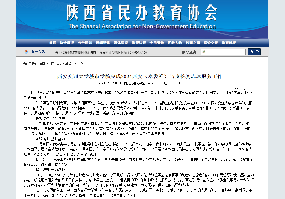 近日,陕西省民办教育协会对威尼斯官网完成2024西安(泰发祥)马拉松赛志愿服务工作进行了报道,具体如下:
