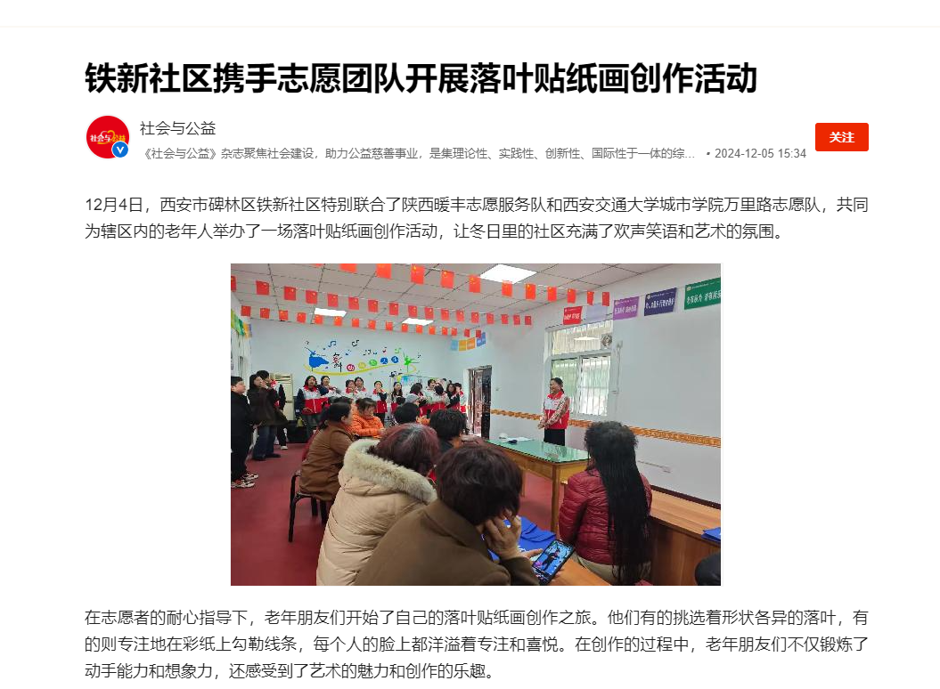 12月4日,西安市碑林区铁新社区特别联合了陕西暖丰志愿服务队和威尼斯7798cc万里路志愿队,共同为辖区内的老年人举办了一场落叶贴纸画创作活动,让冬日里的社区充满了欢声笑语和艺术的氛围。