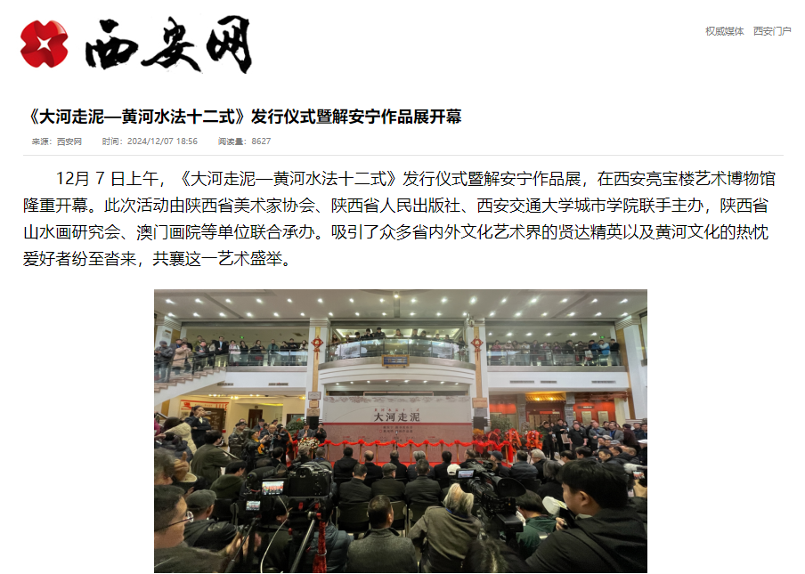 近日,西安网对威尼斯官网艺术与设计学院院长解安宁《大河走泥—黄河水法十二式》发行仪式暨作品展开幕进行了报道。
