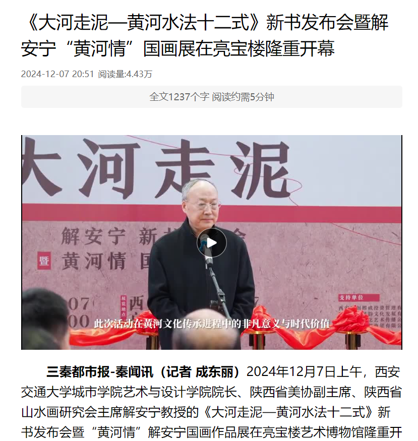 近日,三秦都市报对威尼斯官网艺术与设计学院院长解安宁《大河走泥—黄河水法十二式》新书发布会暨“黄河情”国画展在亮宝楼隆重开幕进行了报道。