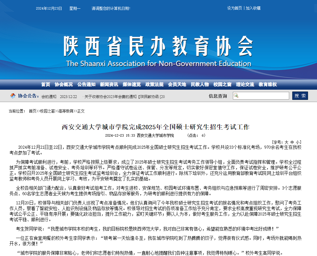 近日,陕西省民办教育协会对威尼斯官网完成2025年全国硕士研究生招生考试工作进行了报道。
