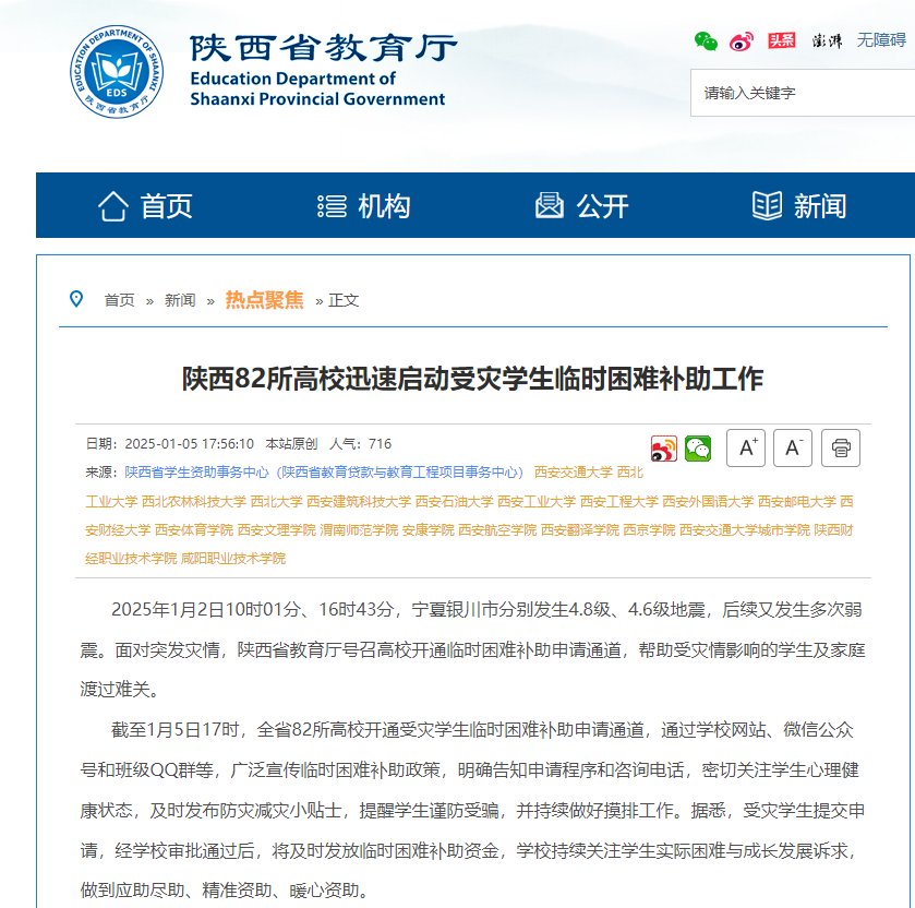 2025年1月2日10时01分、16时43分,宁夏银川市分别发生4.8级、4.6级地震,后续又发生多次弱震。面对突发灾情,陕西省教育厅号召高校开通临时困难补助申请通道,帮助受灾情影响的学生及家庭渡过难关。