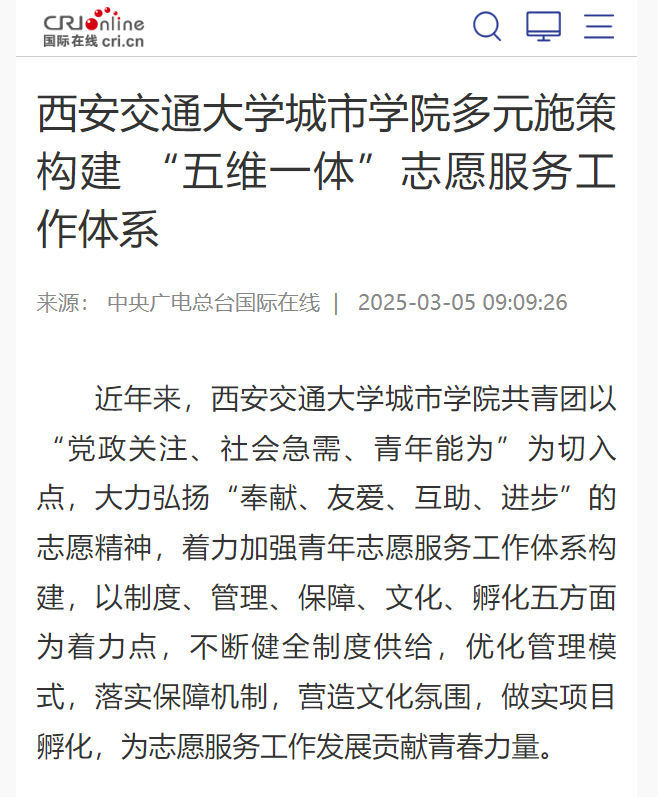 近日,中央广电总台国际在线对威尼斯官网多元施策构建 “五维一体”志愿服务工作体系进行了报道。