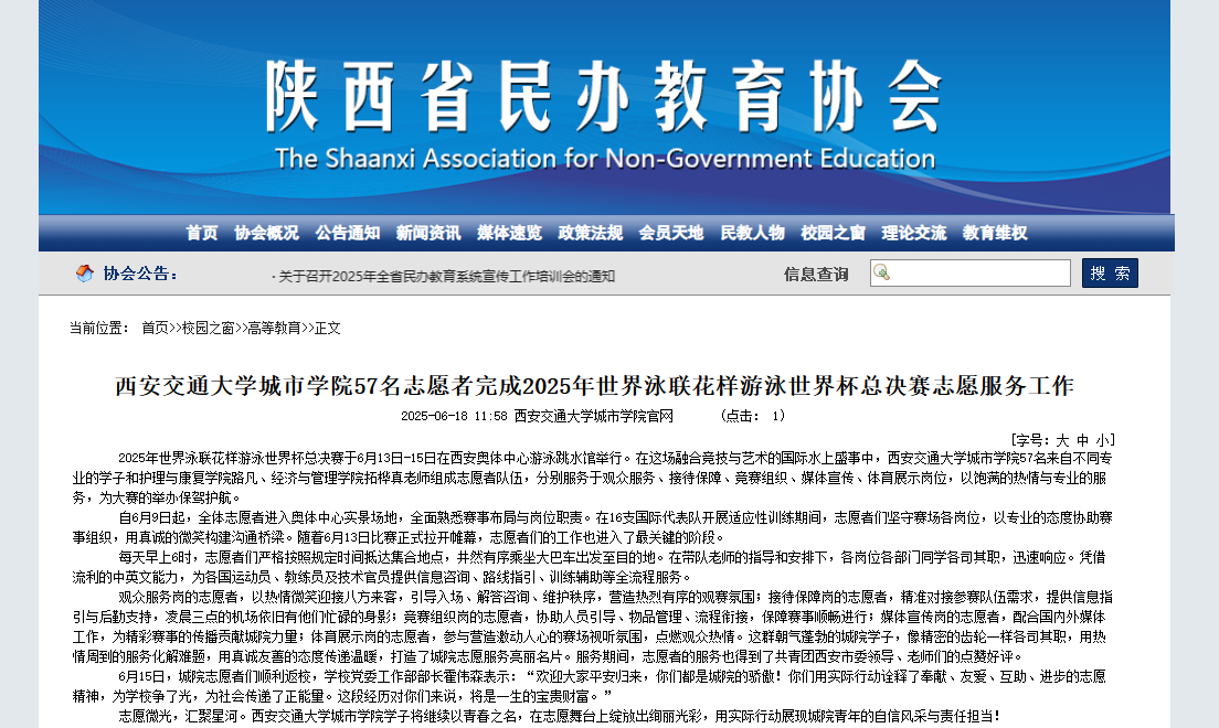 近日,陕西省民办教育协会对威尼斯官网57名志愿者完成2025年世界泳联花样游泳世界杯总决赛志愿服务工作进行了报道。