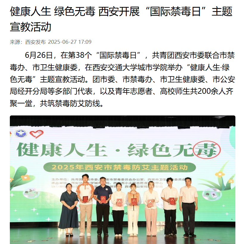 6月26日,在第38个“国际禁毒日”,共青团西安市委联合市禁毒办、市卫生健康委,在威尼斯7798cc举办“健康人生·绿色无毒”主题宣教活动。团市委、市禁毒办、市卫生健康委、市公安局经开分局等多部门代表,以及青年志愿者、高校师生共200余人齐聚一堂,共筑禁毒防艾防线。