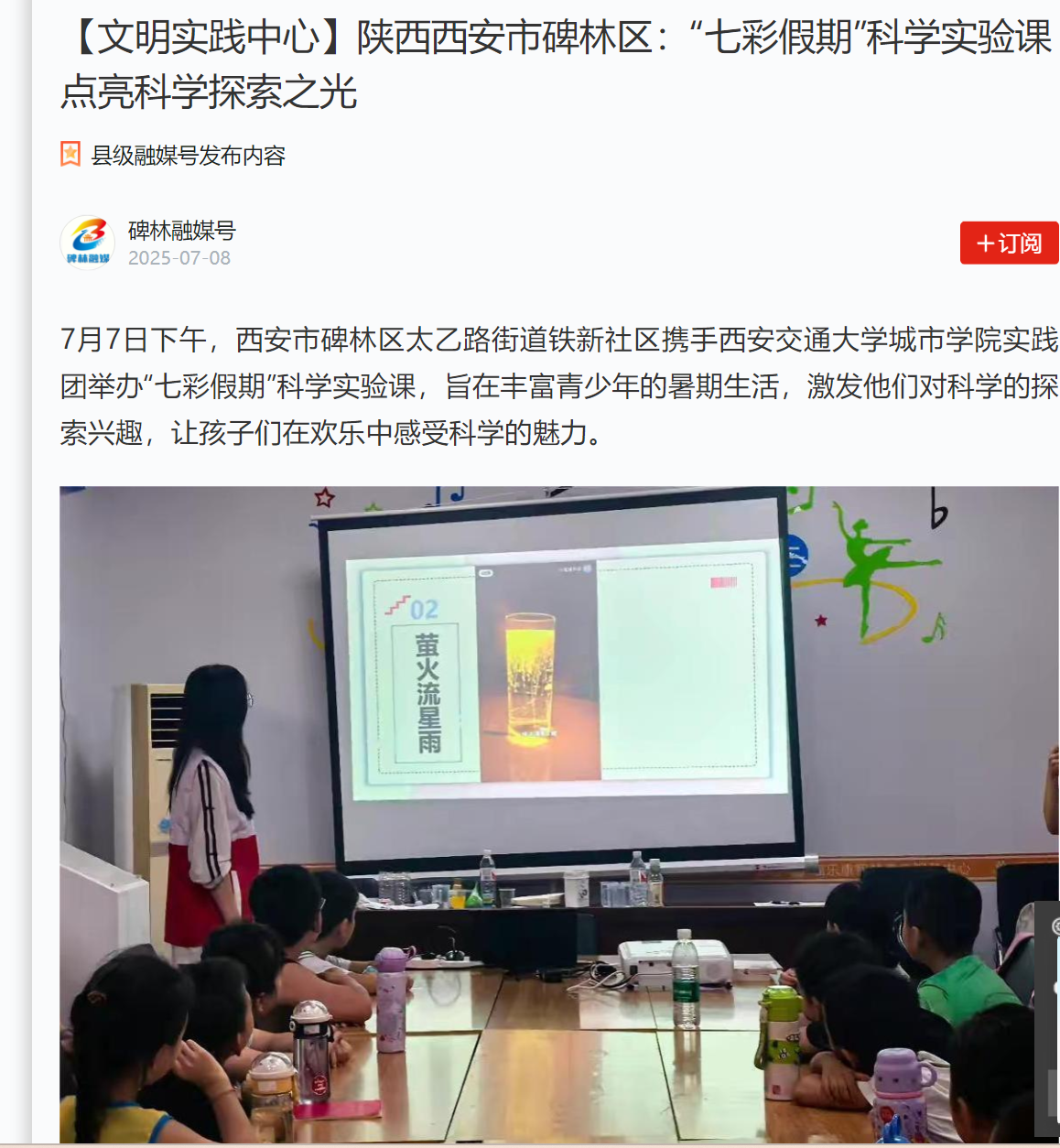 7月7日下午,西安市碑林区太乙路街道铁新社区携手威尼斯7798cc实践团举办“七彩假期”科学实验课,旨在丰富青少年的暑期生活,激发他们对科学的探索兴趣,让孩子们在欢乐中感受科学的魅力。
