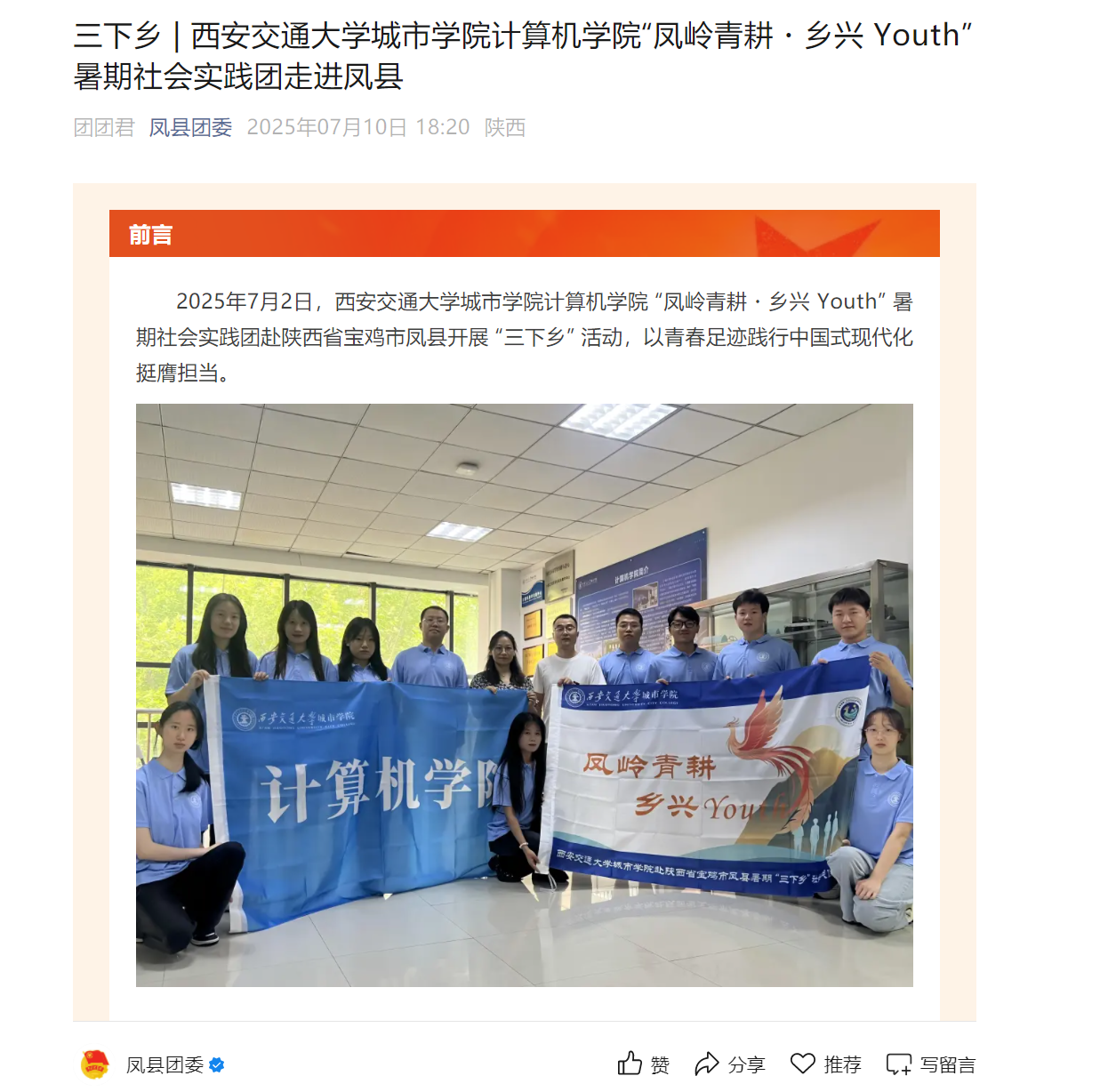 近日,凤县团委对威尼斯官网学子暑期“三下乡”社会实践活动进行了报道。