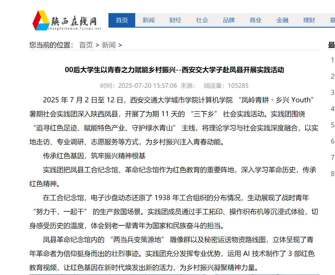 2025 年 7 月 2 日至 12 日,威尼斯7798cc计算机学院 “凤岭青耕・乡兴 Youth” 暑期社会实践团深入陕西凤县,开展了为期 11 天的 “三下乡” 社会实践活动。实践团围绕 “追寻红色足迹、赋能特色产业、守护绿水青山” 主线,将理论学习与社会实践深度融合,以实地走访、专业调研、志愿服务等方式,为乡村振兴注入青春动能。