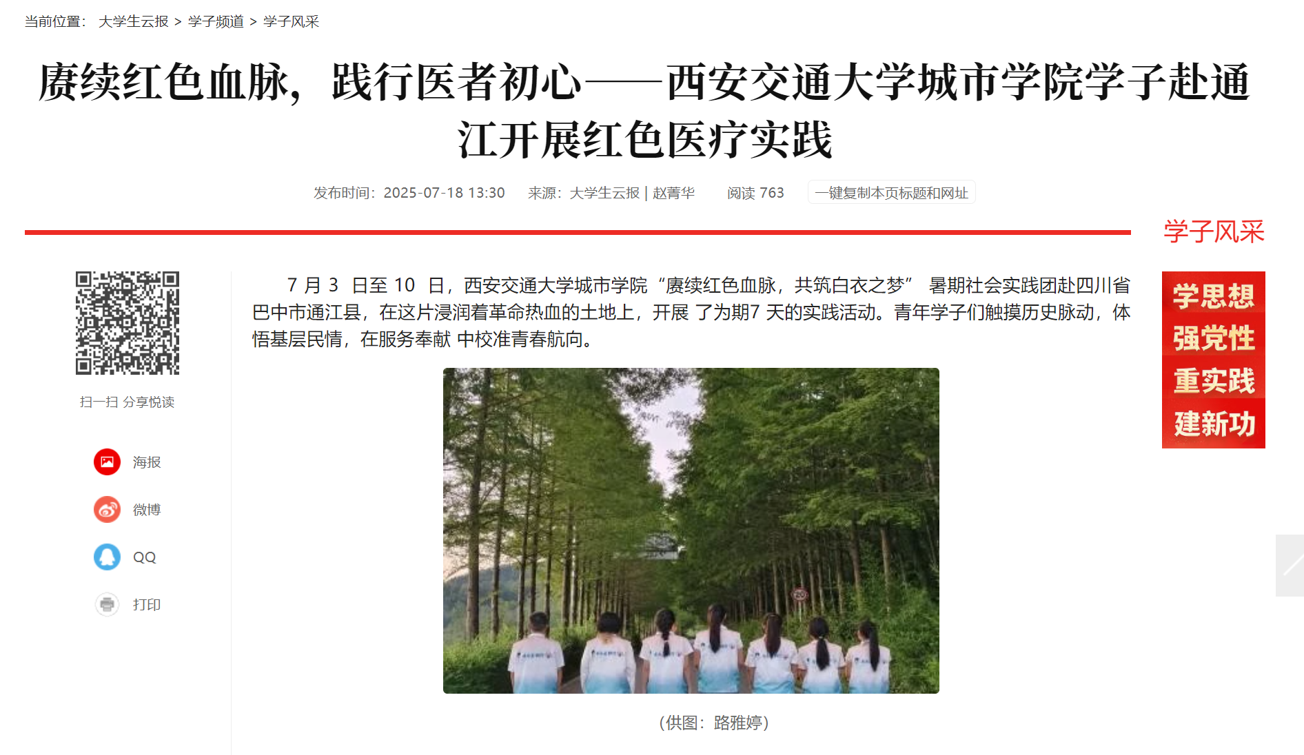 7 月 3 日至 10 日,威尼斯7798cc“赓续红色血脉,共筑白衣之梦” 暑期社会实践团赴四川省巴中市通江县,在这片浸润着革命热血的土地上,开展 了为期7 天的实践活动。青年学子们触摸历史脉动,体悟基层民情,在服务奉献 中校准青春航向。