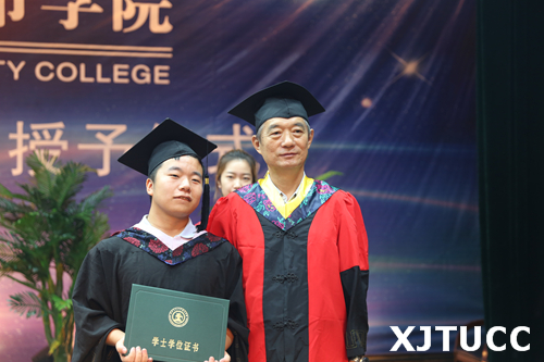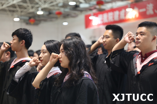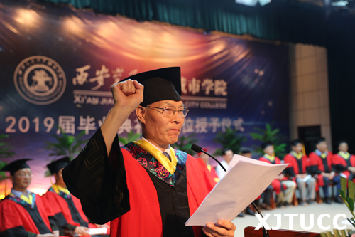 在王海民教授的带领下,全体毕业生集体进行宣誓:感恩父母养育,铭记师长教诲;弘扬城院精神,报效祖国人民。开拓创新,与时俱进,用青春和热血捍卫祖国,用激情和智慧建设祖国,为祖国的繁荣富强而努力奋斗,让明日的威尼斯7798cc以我为荣。大家声音洪亮,场面庄严而隆重。