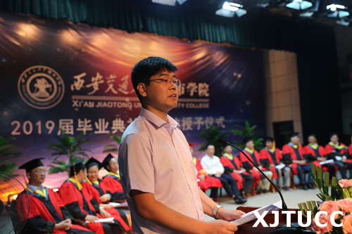 学院党委冯民柱书记宣读关于表彰2019届优秀毕业生、优秀毕业生干部、赴西部赴基层就业优秀毕业生的表彰决定,授予张新宇等141名学生“优秀毕业生”称号,授予徐林等40名学生“优秀毕业生干部”称号,授予苏涛等3名学生赴基层、赴西部就业“优秀毕业生”称号。希望受表彰的毕业生谦虚谨慎、戒骄戒躁、锐意进取、不断进步、扎根边疆、服务基层,在未来的工作岗位上敬业勤业、勇于开拓、再创佳绩,为母校增光。