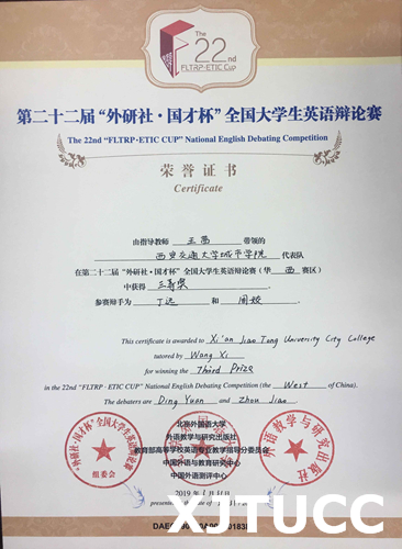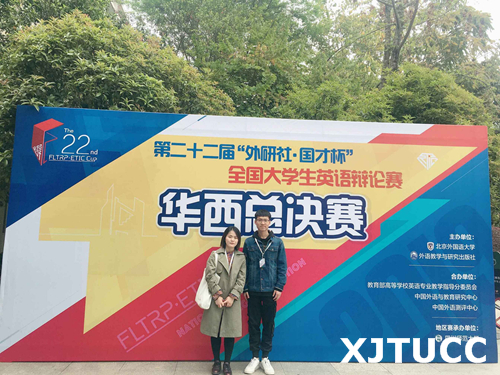 近日,第二十二届“外研社杯”全国大学生英语辩论赛华西赛区决赛在四川师范大学成龙校区举行。我院英语专业学生丁远和周娇在外语系教师王茜的带领下,以较强的英语思辩能力和扎实的口语水平荣获三等奖。