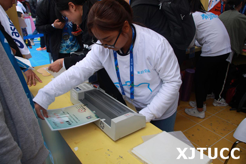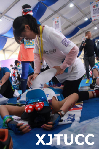 我院此次志愿服务分为A、B两组。10月20日,A、B两组全体成员准时抵达赛事场地。A组成员领取拉伸师衣服、泡沫轴、瑜伽垫及餐包等,统一复习拉伸注意事项,随后给马拉松队员做拉伸。B组成员在指定区域为运动员免费发放姜汤、鸡蛋等食品,并给运动员进行号码布的塑封和奖牌的刻字,以作留念。