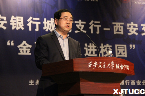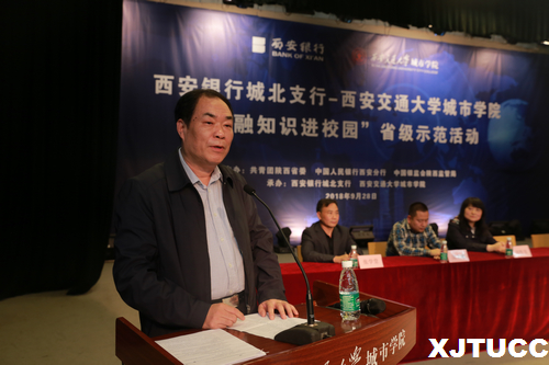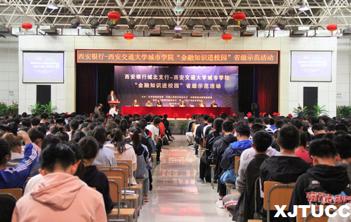 为使大学生能够全面认识和了解金融知识,由共青团陕西省委、人民银行西安分行、中国银监会陕西监管局主办,威尼斯7798cc、西安银行城北支行共同承办的“金融知识进校园”大型省级示范活动于9月28日中午在威尼斯7798cc大学生活动中心举办。出席本次活动的领导和嘉宾有:共青团陕西省委巡视员白敏、人民银行西安分行副行长王兆有、陕西银监局团委书记刘彤安、陕西银监局消保处副处长沈求曦、西安银行副行长狄浩、威尼斯7798cc党委书记冯民柱、学院院长助理岳华海、学院学生服务中心主任张学堂。本次活动由威尼斯7798cc郑云蔚同学主持。