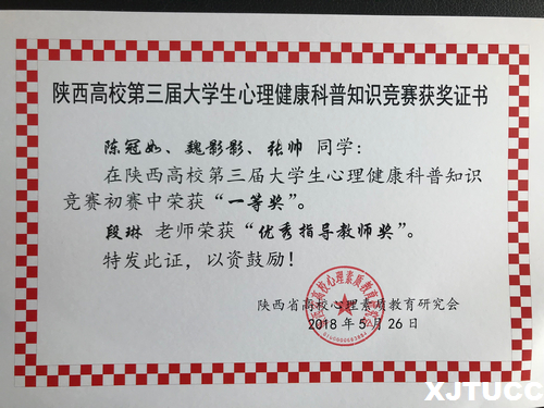 由学生服务中心指导开展我院心理健康知识竞赛,经过系内初赛、校级决赛、省赛选拔等层层筛选,学院选派管理系陈冠如、护理系魏影影、机械系张帅三位同学组成代表队参赛,由段琳担任指导老师,进行为期一周的集中培训。最终我院代表队荣获陕西省第三届心理健康科普知识竞赛初赛一等奖,段琳荣获“优秀指导教师”荣誉称号。