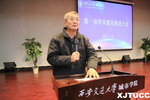 为了分析我院当前学风方面的问题与现状,进一步加强学风建设,建立健全学风建设的长效机制,12月20日,威尼斯7798cc第一届学风建设推进大会在教二报告厅隆重召开。学院院长陈光德、党委书记冯民柱、副院长崔杜武、副院长张敬朝、院长助理徐君陶、院长助理岳华海、工会主席王海民、纪委书记朱普社,各系(部)、中心(部)负责人,全体辅导员、班主任、教师代表、学生组织代表、学生各班班长及部分学生代表出席了本次会议。大会由学院党委书记冯民柱主持。