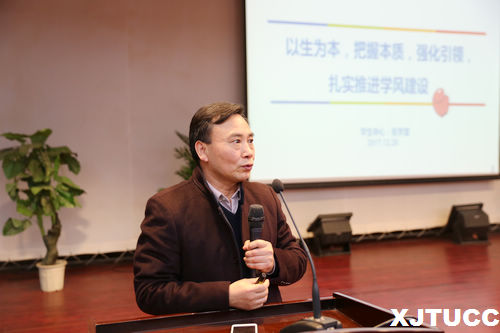 随后,学生服务中心主任张学堂老师做发言。张老师从学院学风建设的基本状况、学风中的存在的主要问题、开展的主要工作以及学风建设推进方案四个方面做了分析,让与会听众能够全面了解学风建设存在的问题和努力方向。张老师指出,学院学生在校内外的获奖情况和综合测评的中的表现是值得肯定,但与优秀高校仍有较大距离。其次,张老师从学院和学生两个角度详细分析了学风中的主要问题,在宿舍、教学、自习等与学生学习、生活紧密相关的方面,做了客观、详细的数据分析。最后张老师对本次学风建设推进方案做了相关解读,并强调学风建设工作最关键的是要落到实处。