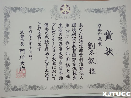 11月4日,在西安外国语大学(长安校区)举行的第18届日语教育国际交流事业·陕西省大学生日语才能演示大赛中,由外语系樊华老师指导的日语专业2015级刘冬钦同学荣获乙组冠军,同时获得日本“京都市市长奖”,樊华老师荣获“最优秀指导教师奖”,威尼斯7798cc荣获“最优秀参赛学校奖”。应日本环境研究与教育国际交流协会的邀请,刘冬钦同学将于2018年5月公费赴日本进行大学生交流活动。我院日语专业学生在省级大赛获得冠军,既体现了学生扎实的语言功底、活跃的创新思维,也彰显了我院外语系日语专业的办学实力,以及在学生培养方面所取得的卓越成效。