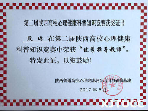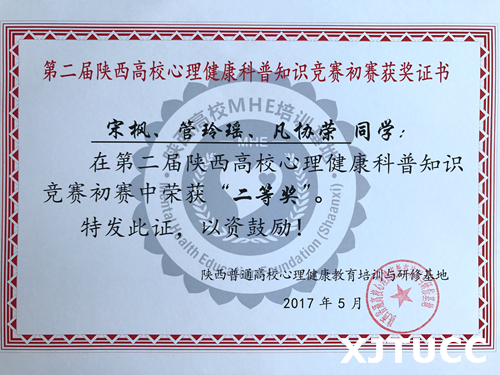 我院经过系内初赛、校级决赛等层层筛选,选派电信系凡协荣、土建系管玲瑶、管理系宋枫三位同学组成代表队参赛。本次初赛以纸笔答题形式开展,题型包括单项选择题、多项选择题、判断题、填空题、论述题等,内容涉及普通心理学、社会心理学、发展心理学、心理咨询以及大学生心理健康等科普知识。经过学生服务中心段琳老师长达一个月的精心指导和同学们的认真准备,我院代表队荣获陕西省第二届心理健康科普知识竞赛初赛二等奖,段琳老师荣获“优秀指导教师”。