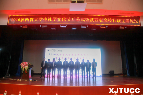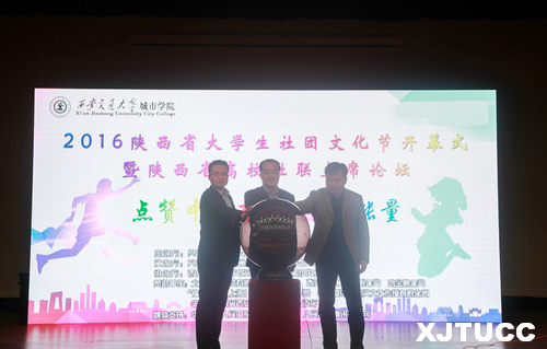 团省委副书记徐永胜发表重要讲话,徐书记对学院在承办此次社团文化节开幕式中的积极工作表示肯定,他强调了学生社团的重要性,希望各高校能大力支持学生社团发展,充分发挥学生社团对文化潮流的引领作用,共创陕西省高校学生社团百花齐放,百花争艳的美好明天。徐书记宣布2016年陕西省大学生社团文化节开幕,并与陈光德院长、省学联陈怀祥主席在全场倒计时声中共同点亮了启动球。随着与会领导、嘉宾上台合影留念,2016年陕西省大学生社团文化节开幕式圆满结束。