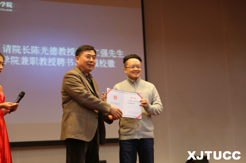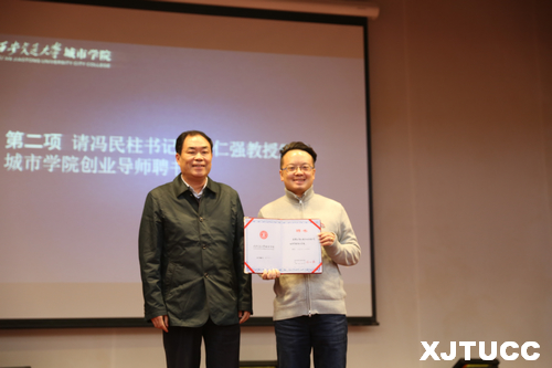 陈光德院长为郑仁强颁发兼职教授聘书并为其佩戴校徽,冯民柱书记为其颁发创业导师证书。郑仁强老师感谢学院领导的信任,表示今后将用自身的创新创业知识与资源回馈学院与师生。陈光德院长在讲话中对郑仁强老师的到来表示欢迎,同时号召学院学生踏实学习的同时积极参与创新创业活动,全面发展。