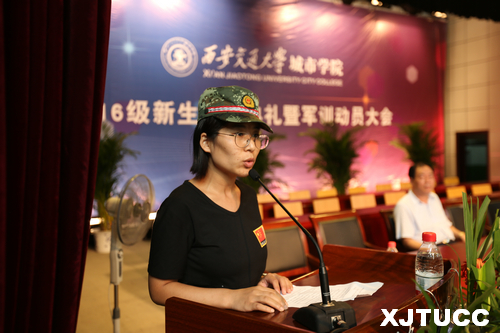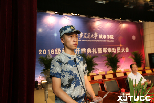 会议伊始,学院副院长崔杜武宣布了学生军训团成立及营以上干部名单。陈光德院长向军训团团长授旗。在一营营长徐乾的带领下,全体学员进行了入伍宣誓,高亢激昂的誓词展现了他们完成军训任务的勇气与决心。