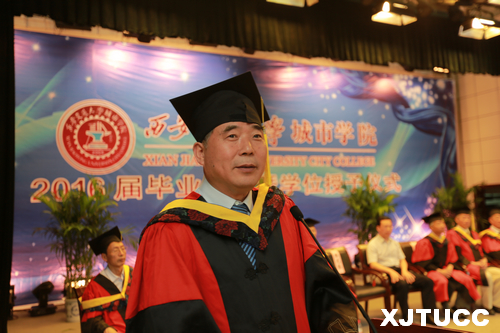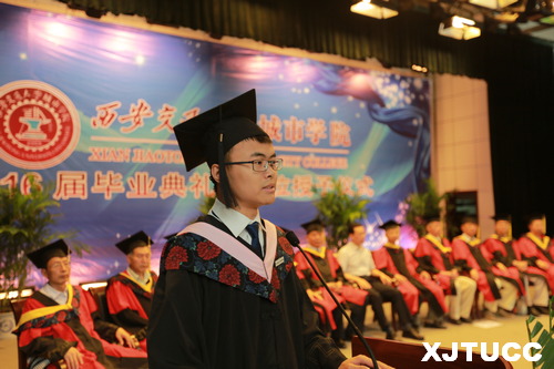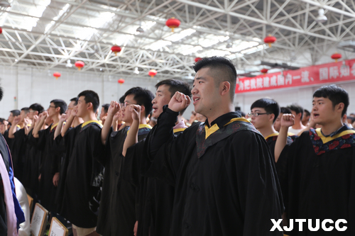 在王海民教授的带领下,全体毕业生集体进行宣誓:感恩父母养育,铭记师长教诲;弘扬城院精神,报效祖国人民。开拓创新,与时俱进,用青春和热血捍卫祖国,用激情和智慧建设祖国,为祖国的繁荣富强而努力奋斗,让明日的威尼斯7798cc以我为荣。大家声音洪亮,场面庄严而隆重。